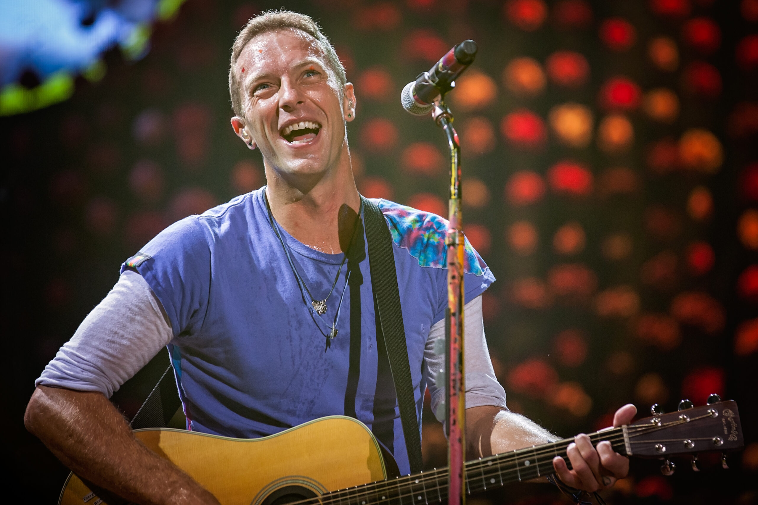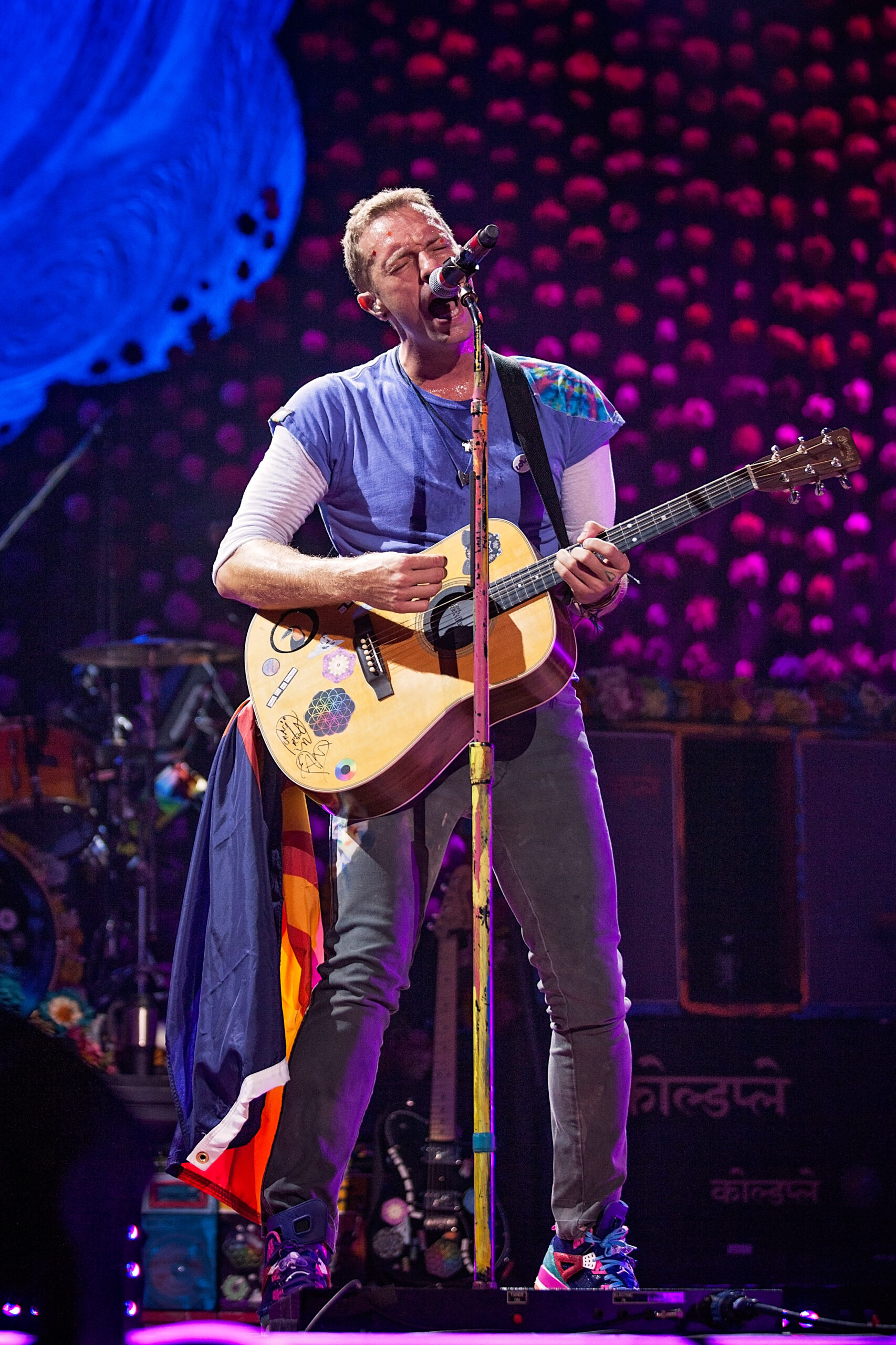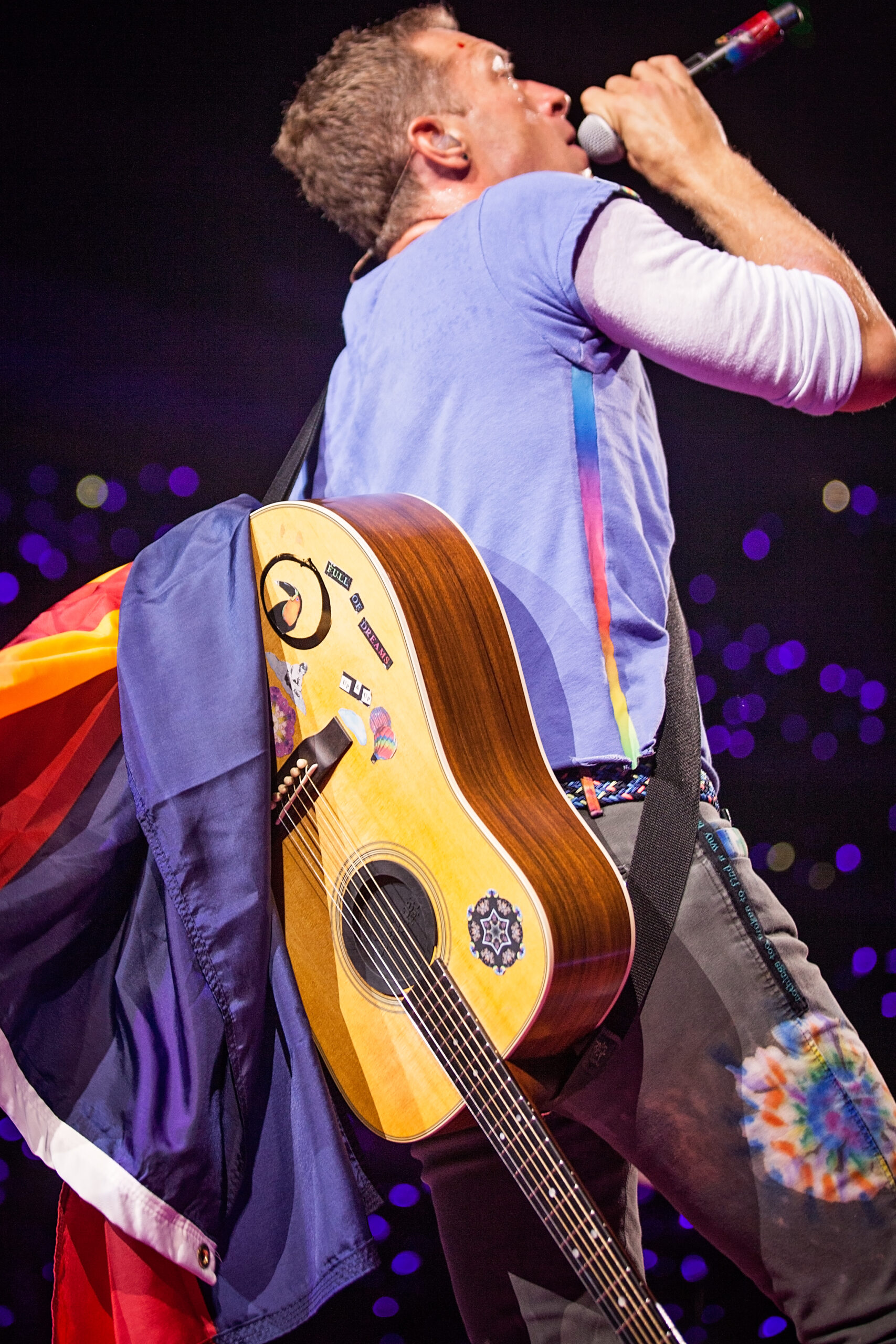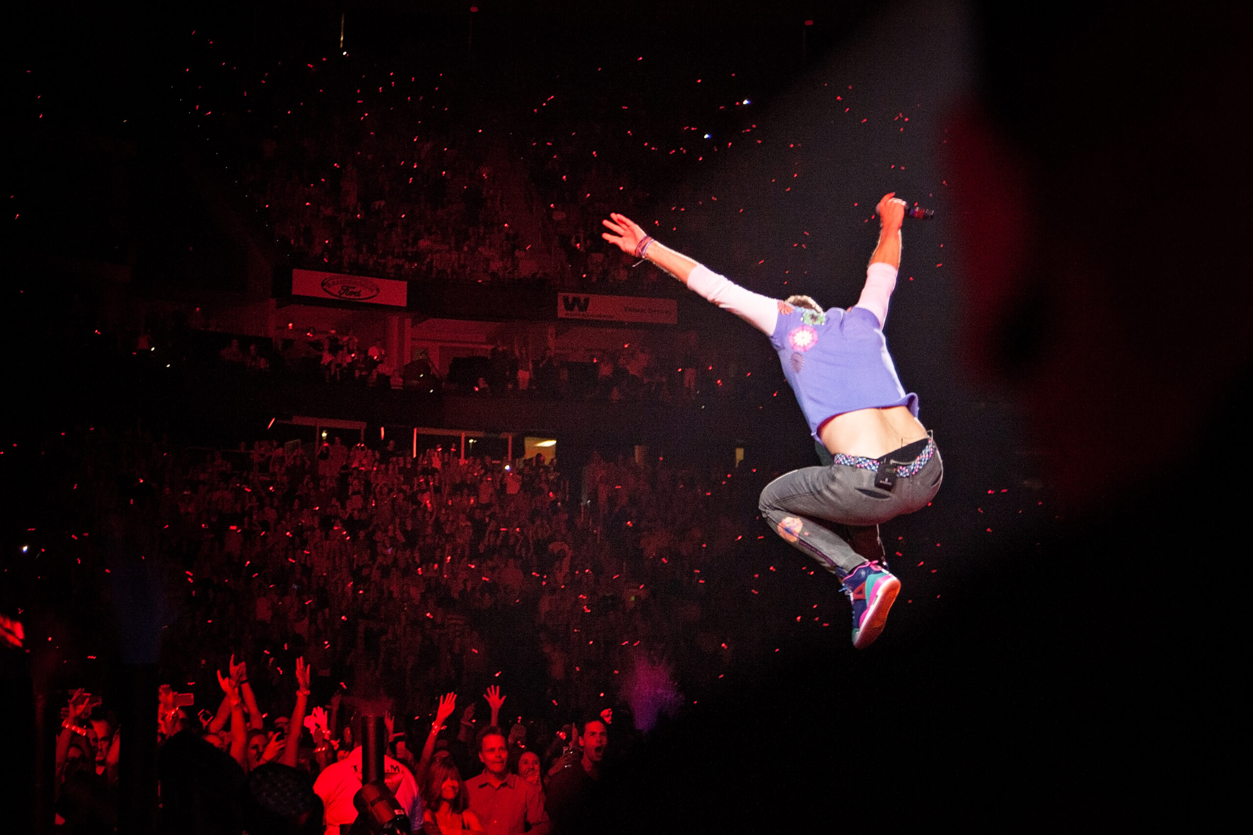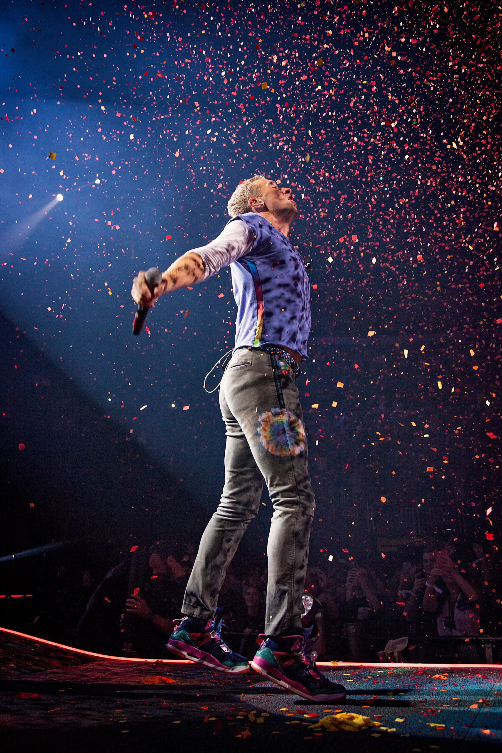 Rainbow colored confetti fell from the top of the packed arena, holding nearly 19,000 screaming fans, as Coldplay opened their show with one of their newest hits, Head Full of Dreams. Lead singer, Chris Martin, danced down the catwalk, smiling and making eye contact with his adoring fans. Martin then grabbed his tie-dye decorated guitar and sang Yellow, the first song that introduced us to Coldplay so many years ago. He later rocked back and forth on his signature piano, draped with brightly colorful flowers, as he performed their hit Paradise and the crowd’s LED wristbands given to them as they entered the show lit up in coordination with the song. For a toned down performance of Magic, band members joined Martin at the tip of the catwalk and the crowd roared as Martin customized the lyrics to say, “Still I call it magic, when I’m here with all of you”. Martin then pulled up a sweet, seven-year-old boy from the audience and went on to perform the heartfelt ballad, Everglow, after asking the audience to send out love and good vibes to the rest of the world in need. The band started rocking again as they played Speed of Light and rainbow colored glitter shot out from the stage during Hymn For The Weekend, as Martin twirled down the runway. Gigantic balloons bounced around during Viva La Vida and Martin’s playful and witty sense of humor was showcased as he stopped and restarted the song, joking that he had messed up the lyrics. The crowd’s wristbands once again lit up during Sky Full of Stars, creating a sea of twinkling blue lights.
