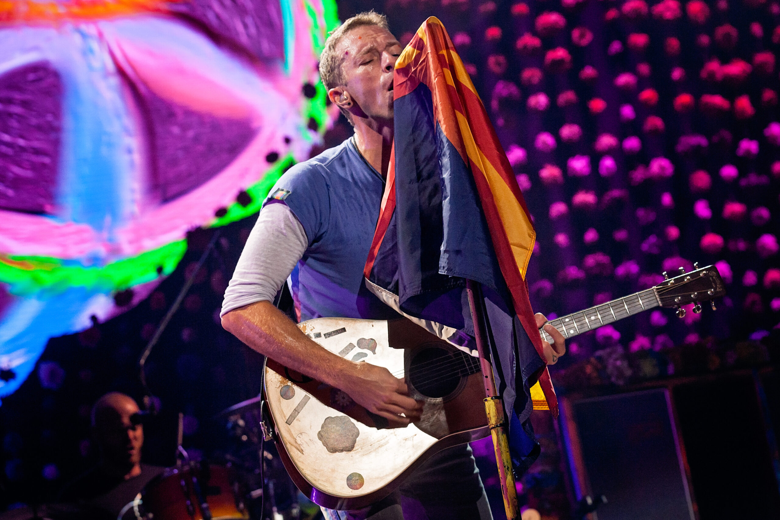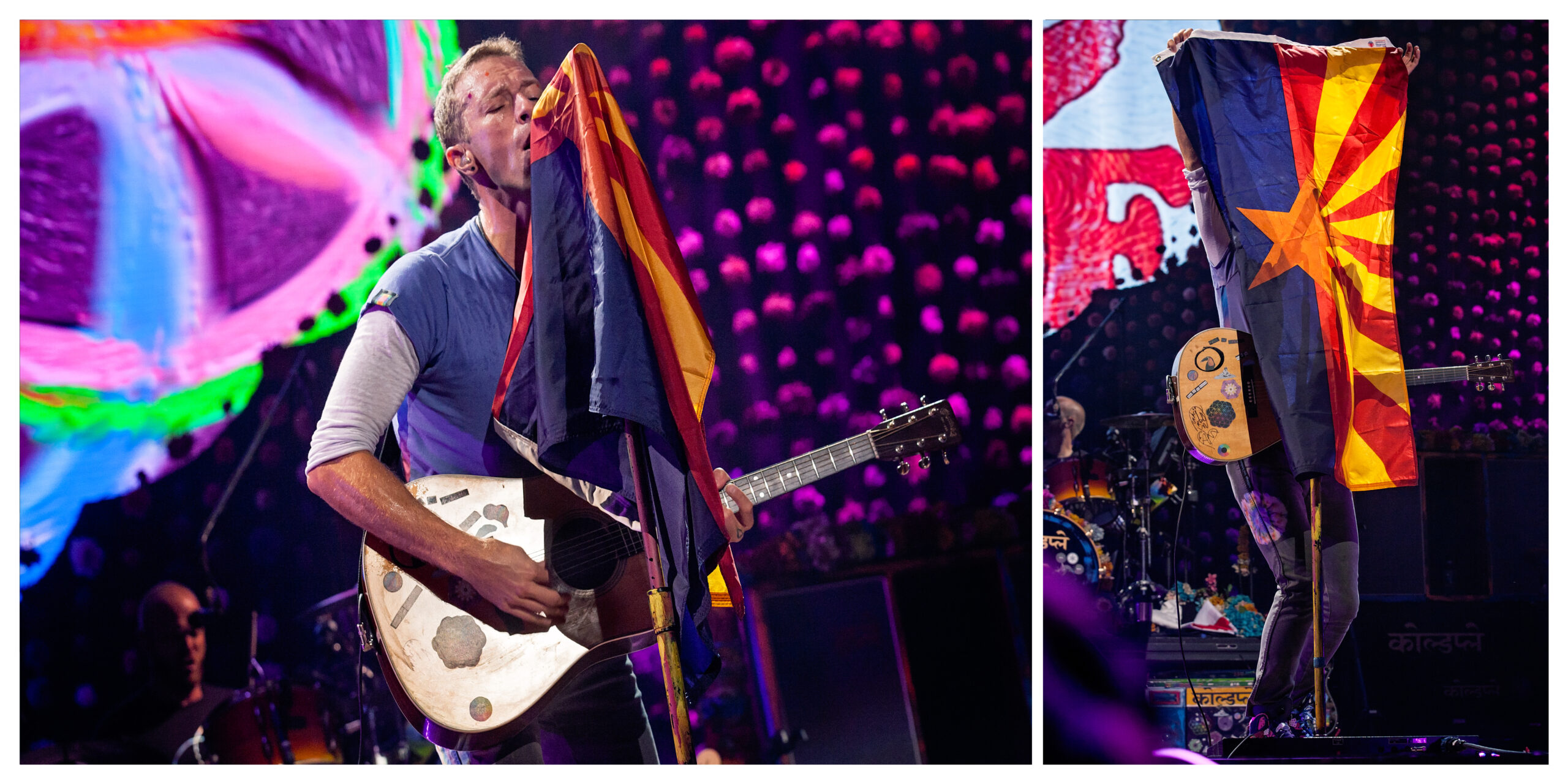 Finally, Martin, Buckland, Berryman and Champion made their way to the front of the stage, arm in arm, and took several bows as the audience cheered. Their gratitude seemed genuine and endearing as they laid out a red and white flag with the word “LOVE’ on it and then walked off the stage. Earlier in the show, a clip of the late Mohammed Ali was played where Ali says, “So I’m going to dedicate my life to using my name and popularity to helping charities, helping people, uniting people…we need somebody in the world to help us all make peace.” I can’t help but feel that Coldplay, in their own way, is doing just that.