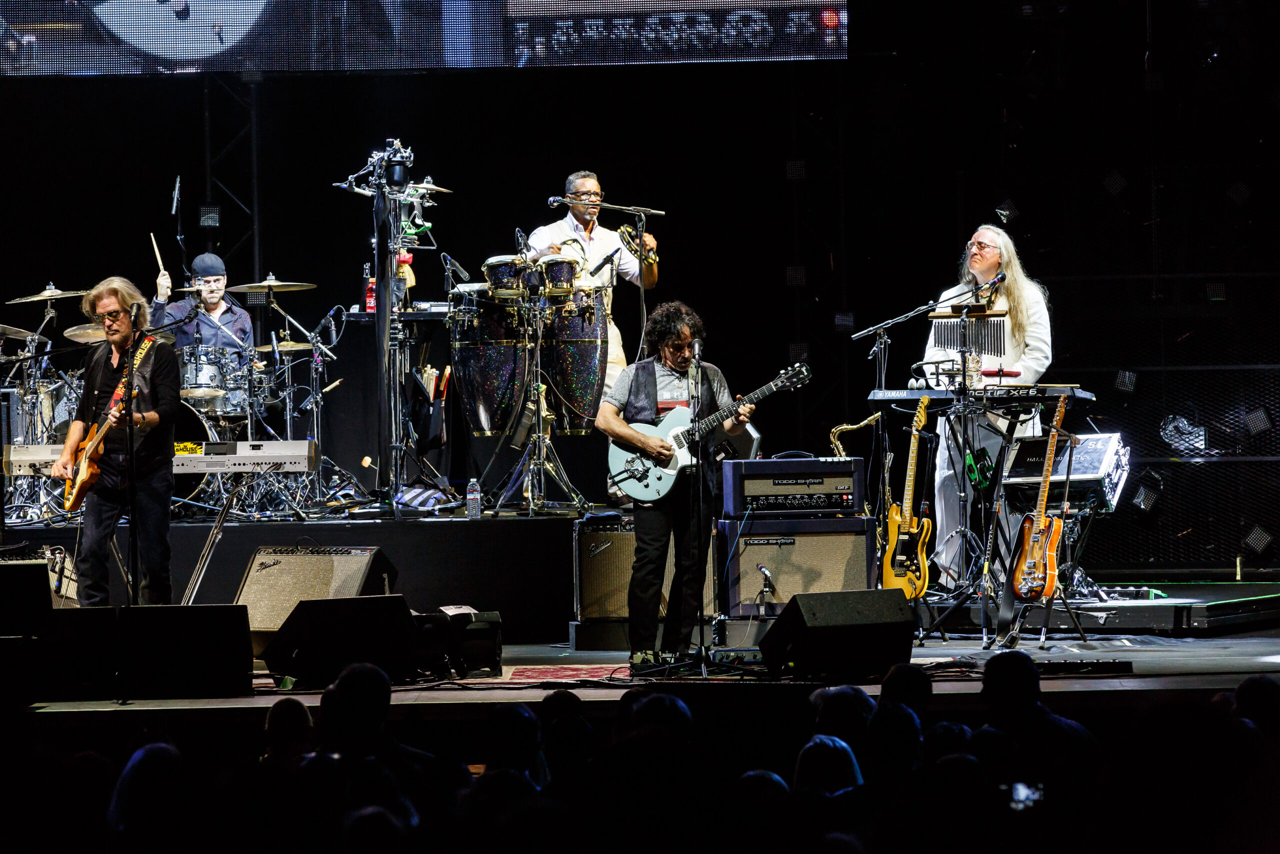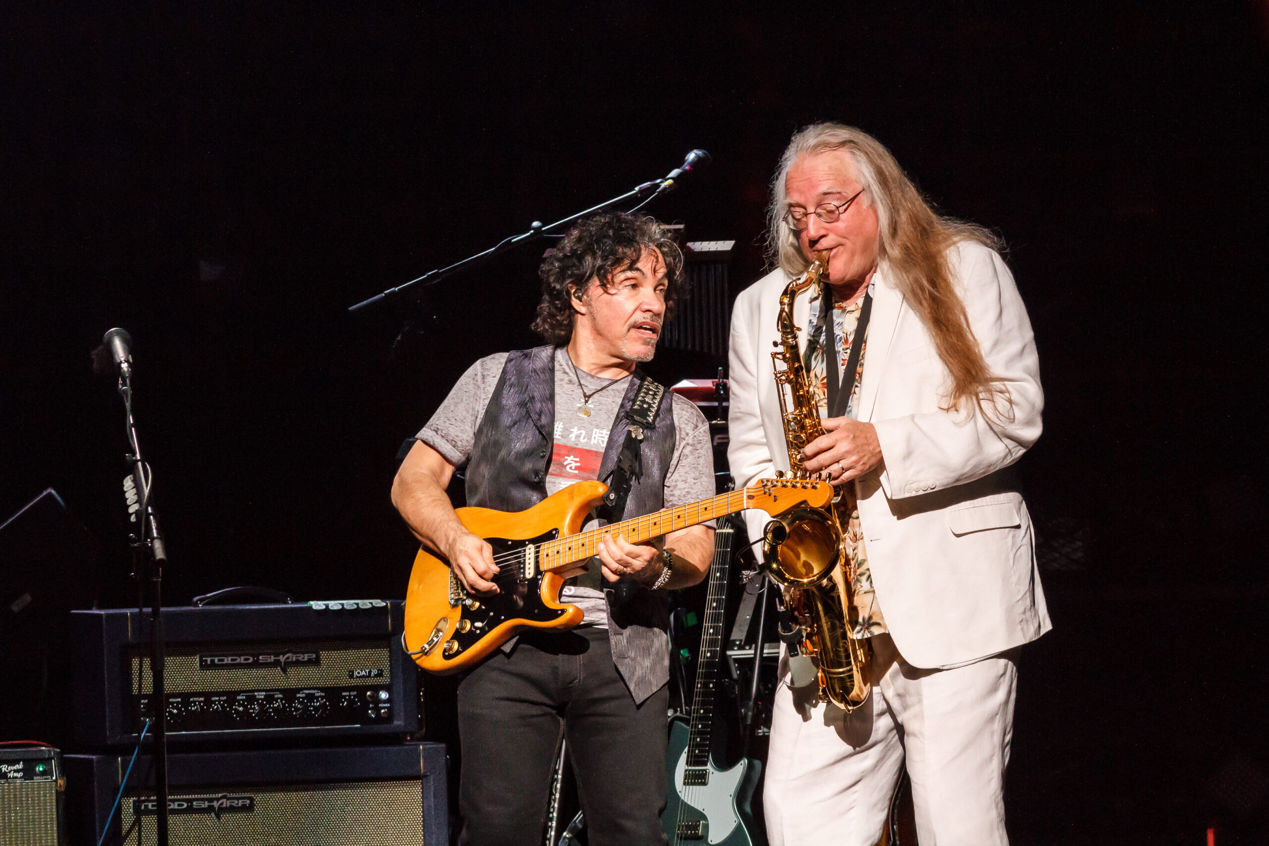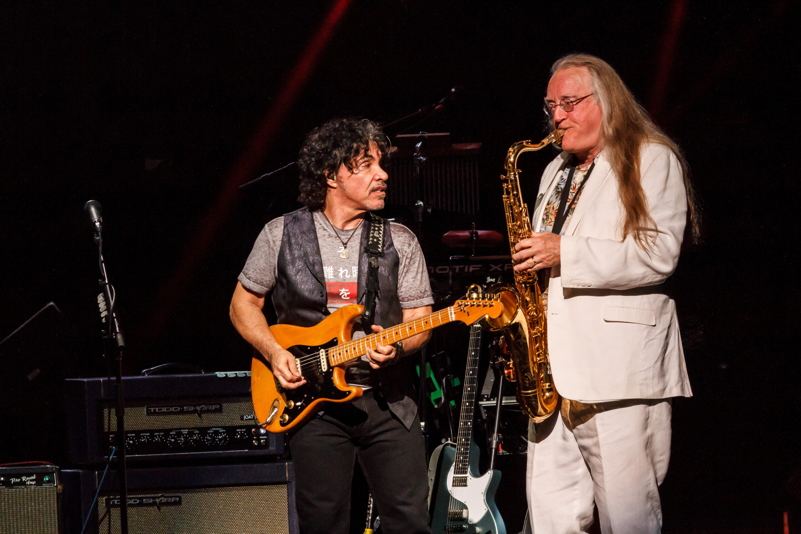 They started their set with 2 of their number 1 hits and fan favorites, Maneater and Out of Touch.  From the beginning of the show, the audience was up and dancing.  During Las Vegas Turnaround two ladies in the front row were dancing and each time the band sang “Turnaround” the ladies would spin around.  At one part of the song, Charles came out to the front of the stage with his sax and jammed with John.  Daryl Hall introduced the next song, She’s Gone and said it was the song that helped get them out of Philly.  During She’s Gone the audience was not only dancing but started singing along with the band.  At this point in the show the band slowed the tempo down a little on the next song, Sara Smiles.  During Sara Smiles, Pat Buchanan got to do his first guitar solo.  For the remainder of the show, Daryl Hall gave up is guitar and got behind his keyboard.  The set ended with the band playing I Can’t Go for That, with Charles walking across the stage playing his sax and jamming with Pat and John.  The band came back for a 2 song encore that included Kiss on my List and Private Eyes.