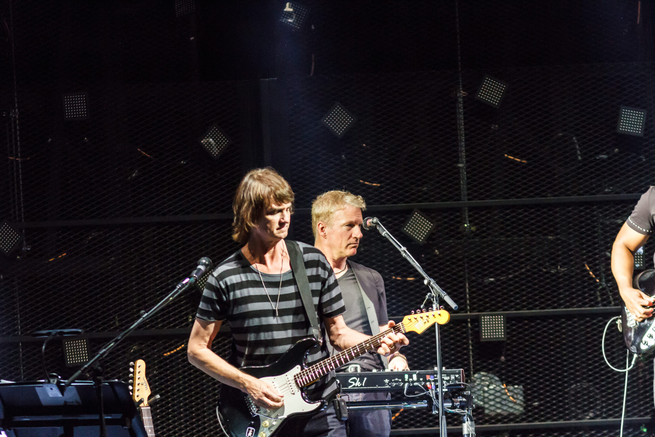 It’s a Wednesday night, a work and school night and the audience slowly wanders into AK Chin Pavilion as the first band starts playing for tonight’s concert.  Everyone is here to see one of their favorite bands, Hall & Oates.  Daryl Hall and John Oates are an American musical duo from Philadelphia.  Their style of music is a mixture of rock and roll and rhythm and blues.  They started in the early 70s and had a couple of hits, Sara Smiles and Rich Girl, but their real fame came in the 80s starting with their album Private Eyes.  One of their big breaks came in the 80s with the advent of MTV and music videos.  These videos were like a mini concert and allowed them and their music to be seen by millions of young adults and kids which helped push the band into mega-stardom.  During their 40 plus year history they have had six No. 1 hits, seven platinum albums, and six gold albums.  In 2014 they were inducted into the Rock and Roll Hall of Fame and just this year they received a star on the Hollywood Walk of Fame.  Their current touring band consists of Brian Dunne on drums, long time member Charles DeChant on flute, keyboards, saxophone, Eliot Lewis on keyboards, Klyde Jones on bass, Pat Buchanan on guitar and Porter Carroll on percussion.