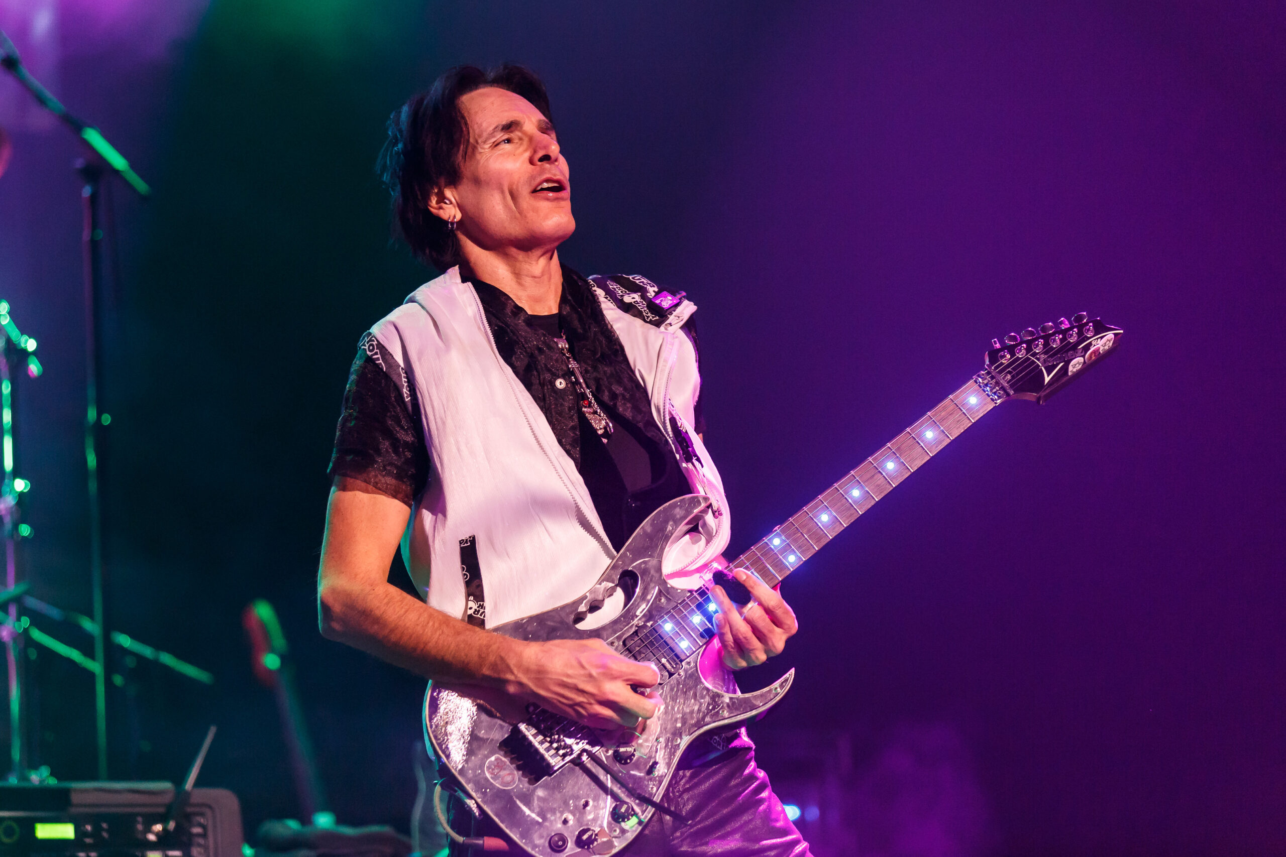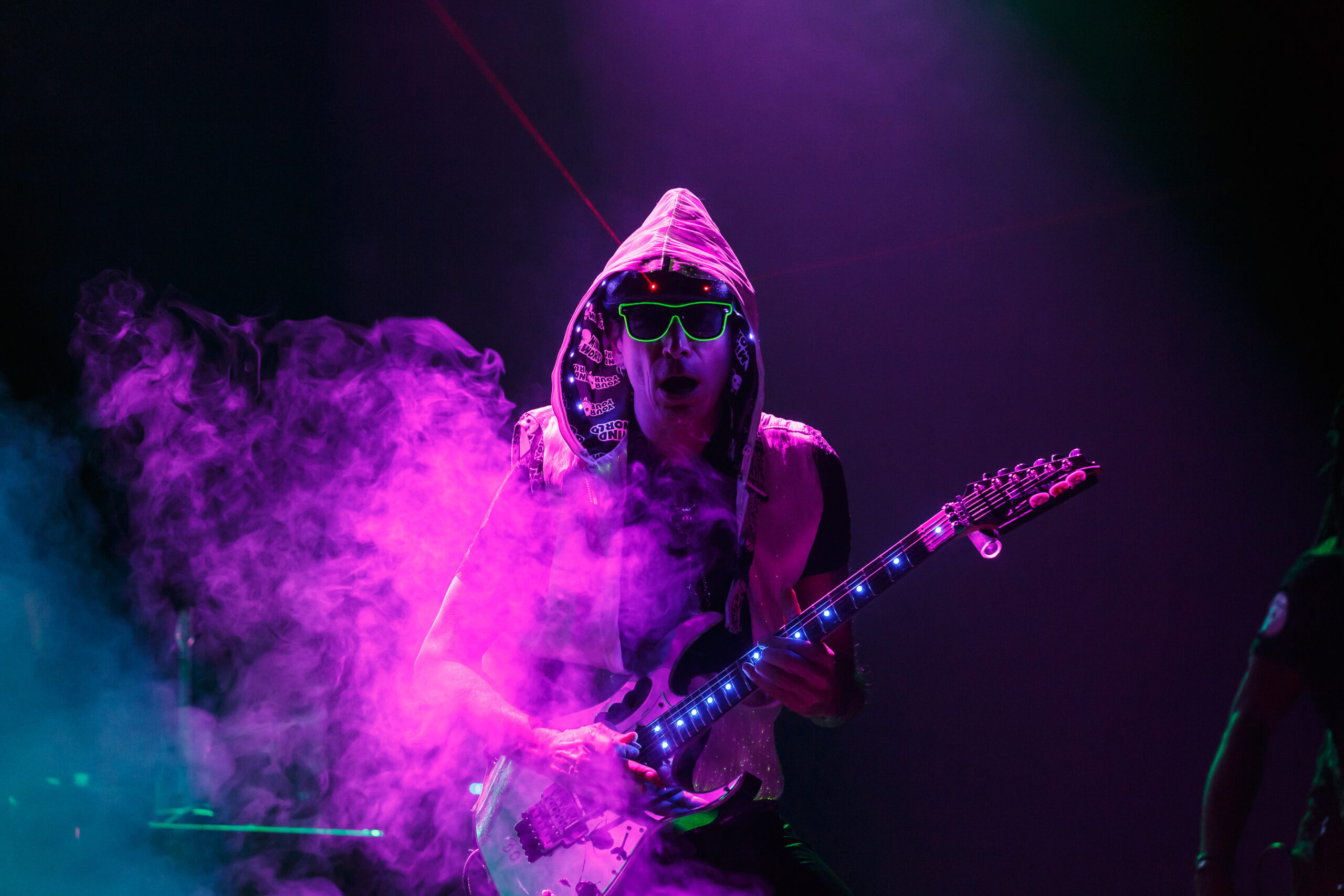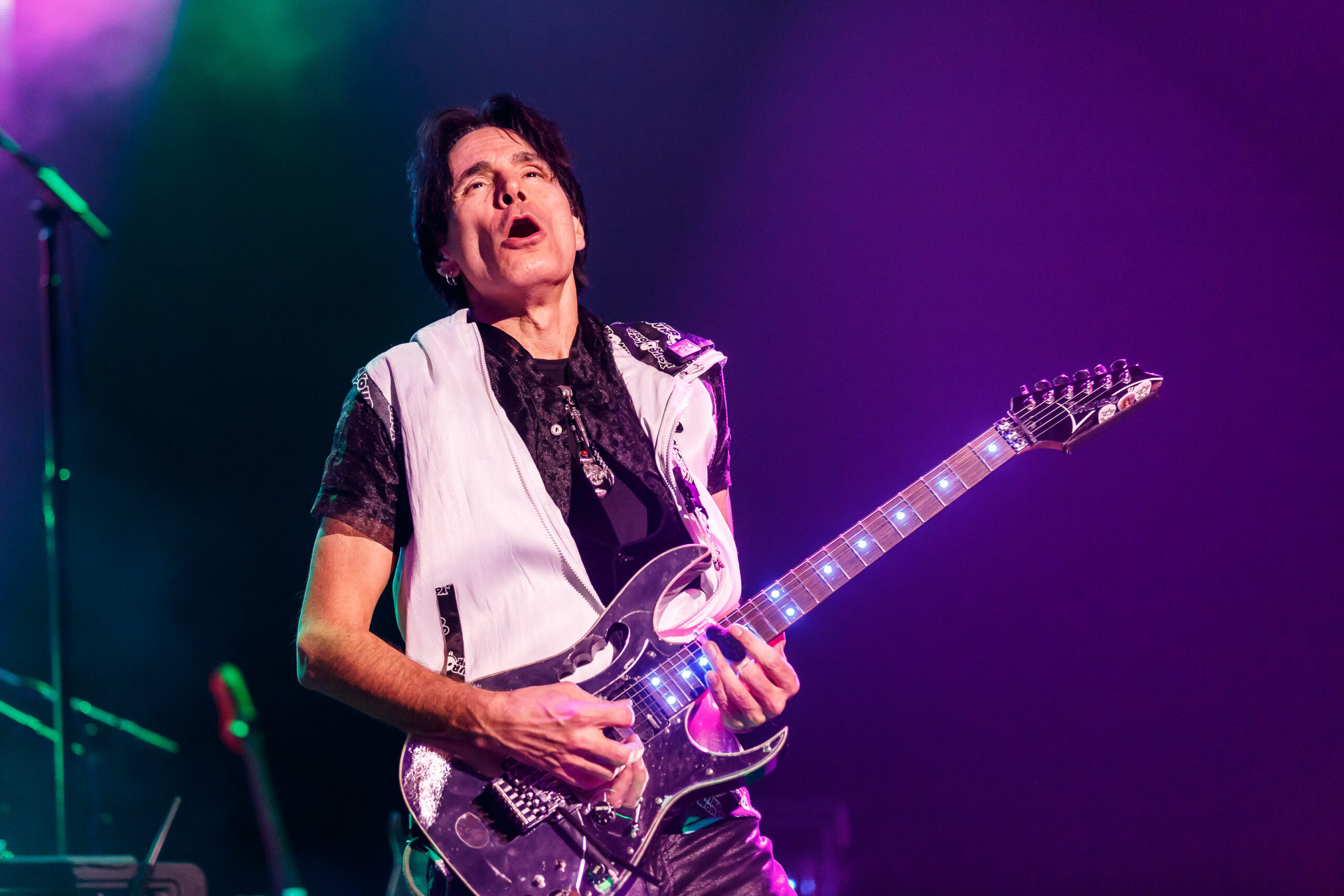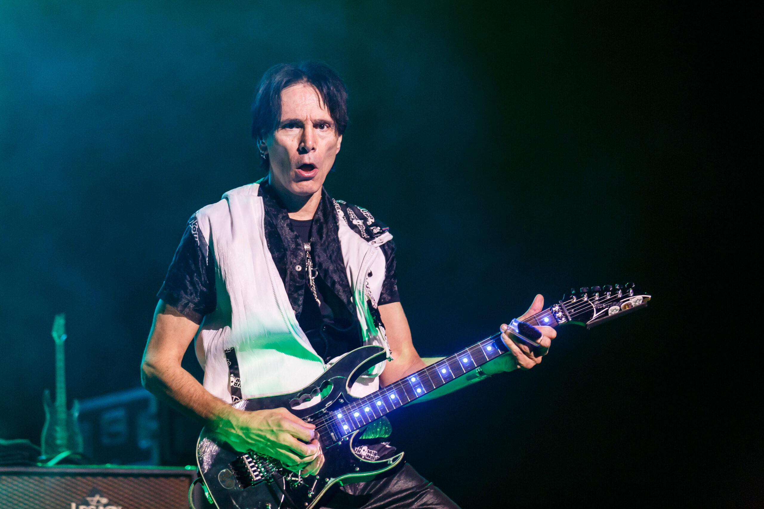 It didn’t take long for the show to get going, as a quick video of Vai’s performance as Satan’s best guitar player in the movie Crossroads kicked off the show into the song “Bad Horsie.”  Draped in a reflective and neon cloak (that shot lasers into the crowd), Vai made his presence known from the very beginning.  With the band quickly joining in, a brief set of songs including “Crying Machine” and “Gravity Storm” would soon lead into the performance, in its entirety, of Passion and Warfare.  It’s here where the special nature of the show truly took shape.