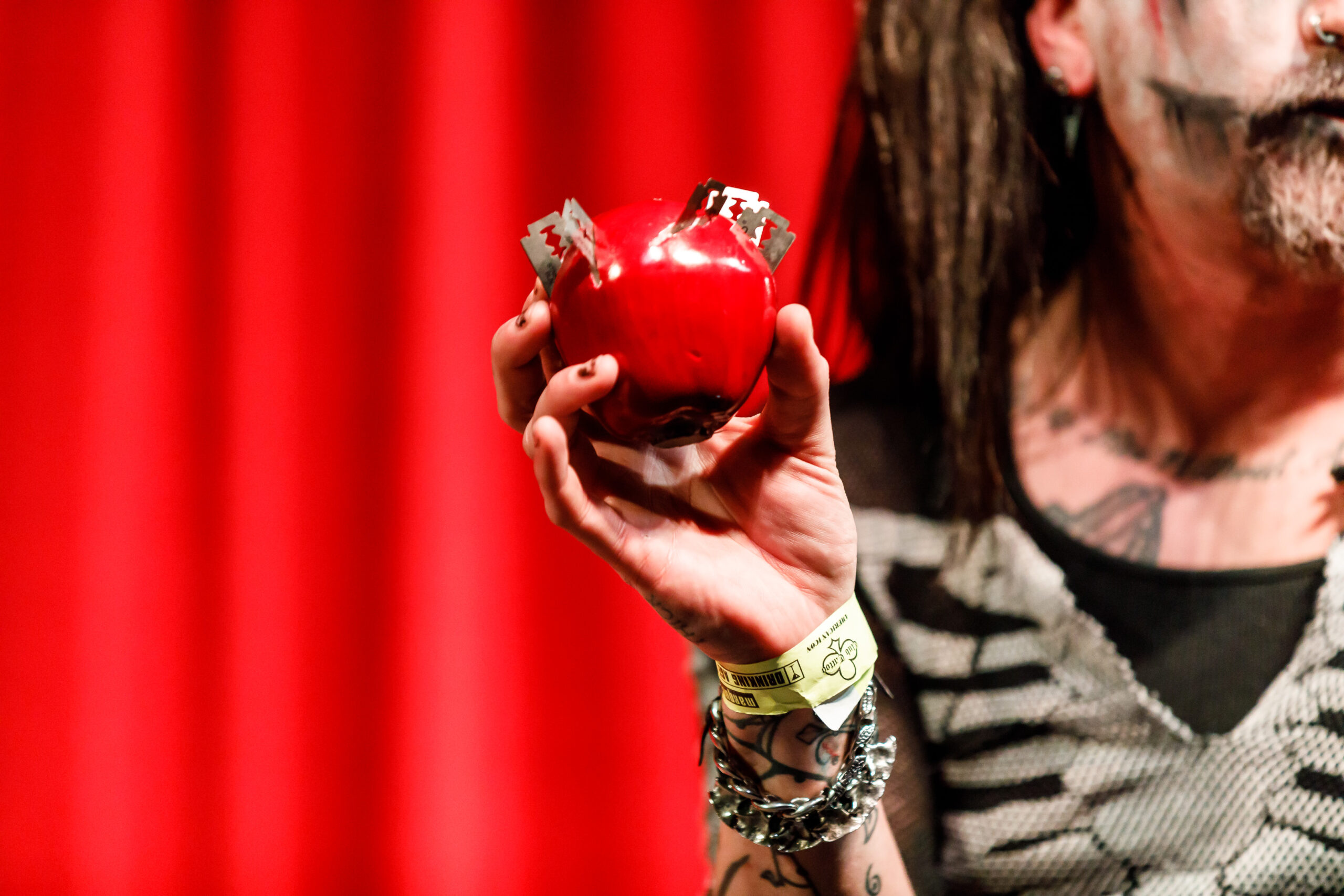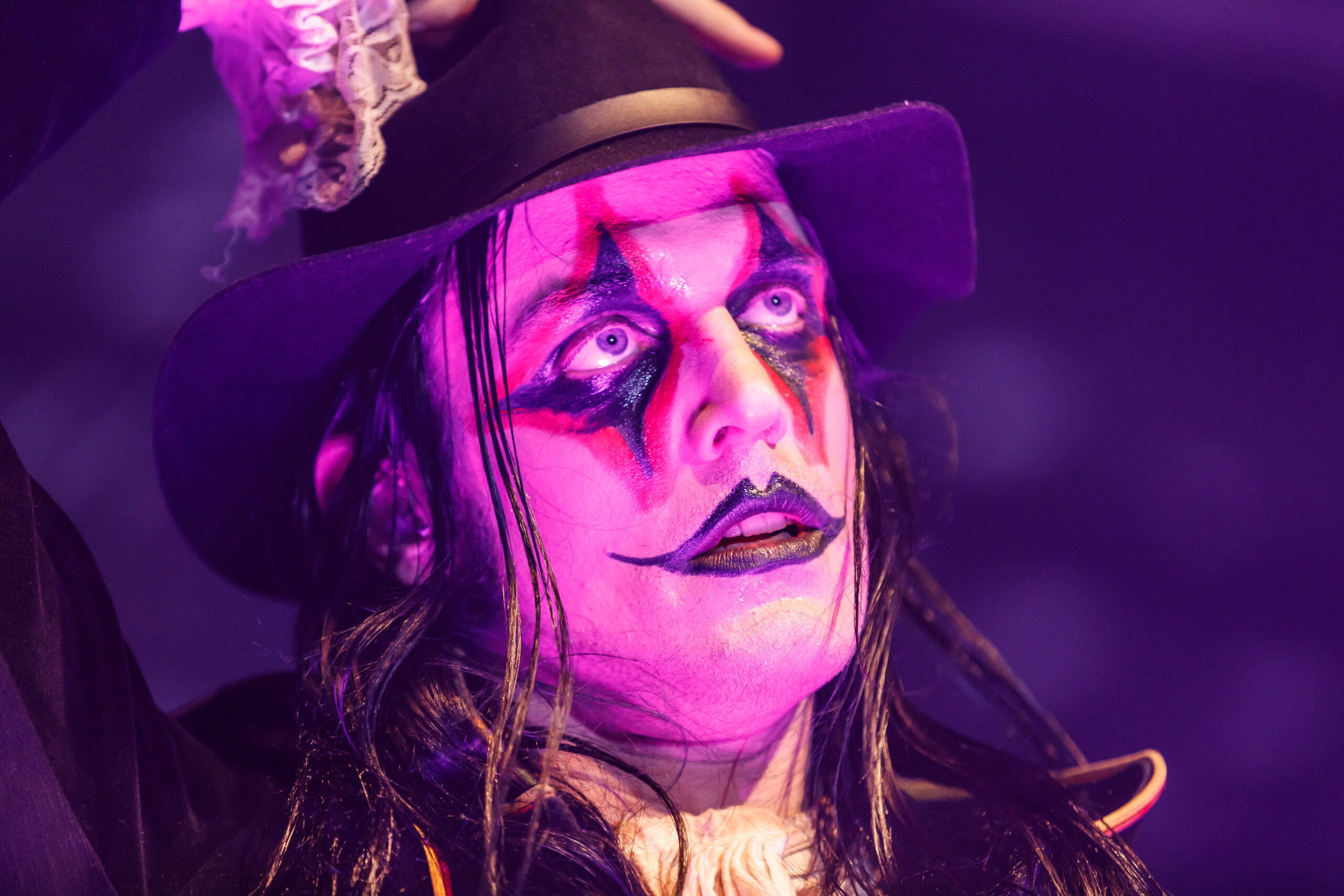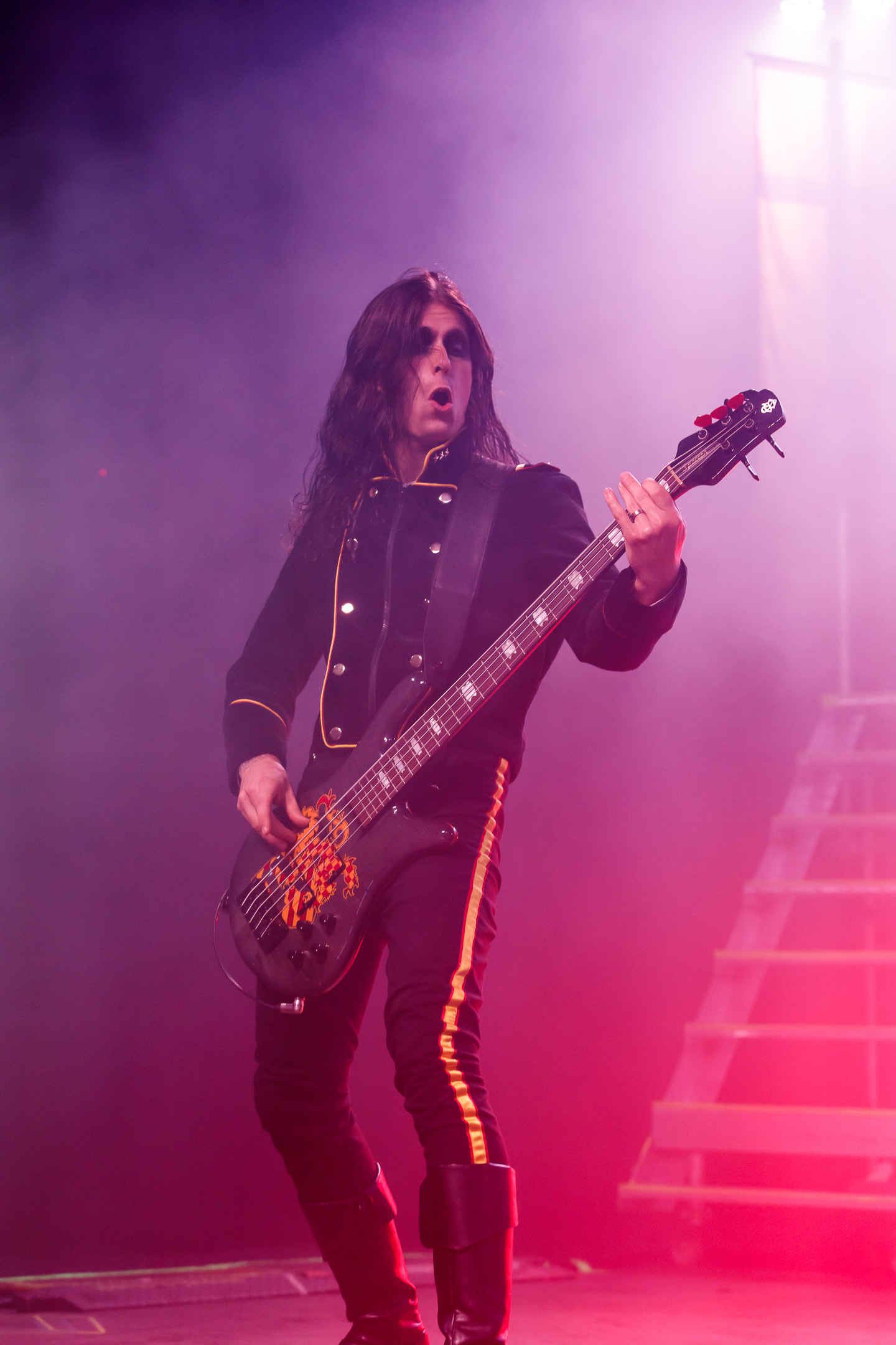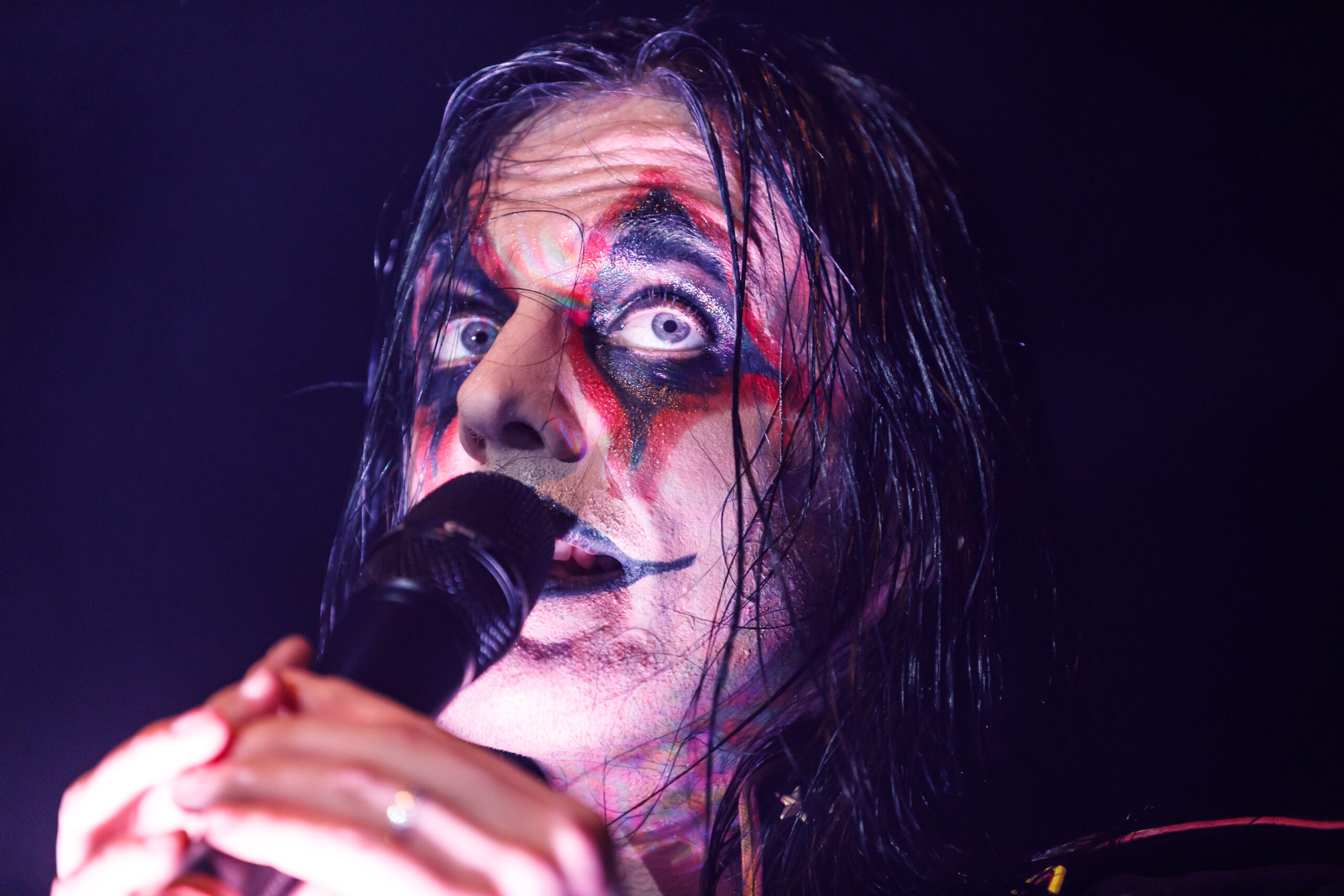 Next to it is a giant banner of the King. The music starts playing in the background and it is the new song “Glory To Our King” from Avatar’s newest album Avatar Country. The banners and curtain drop and we see an empty stage with just the drum set. Then the King appears on a raised stage behind and above the drum set. It is lead guitarist Jonas “Kungen” Jarlsby, dressed up as the King including a royal robe and crown. He is sitting on his throne and has his red guitar. All at once he slams out the beginning power riffs to “Legend of the King”. As he is assailing us with his power cords, the rest of the band emerges on stage. Johannes Michael Gustaf Eckerström struts out and grabs the mic and starts pounding out the lyrics. As Johannes is singing, bassist Henrik Sandelin and guitarist Tim Öhrström are head banging as they play along. Just up in from of the King, drummer John Alfredsson is driving the crowd (and my ears) wild with his double bass. So starts the wonder that is Avatar.