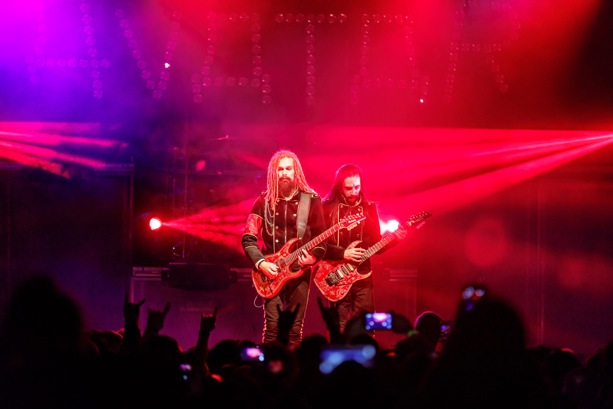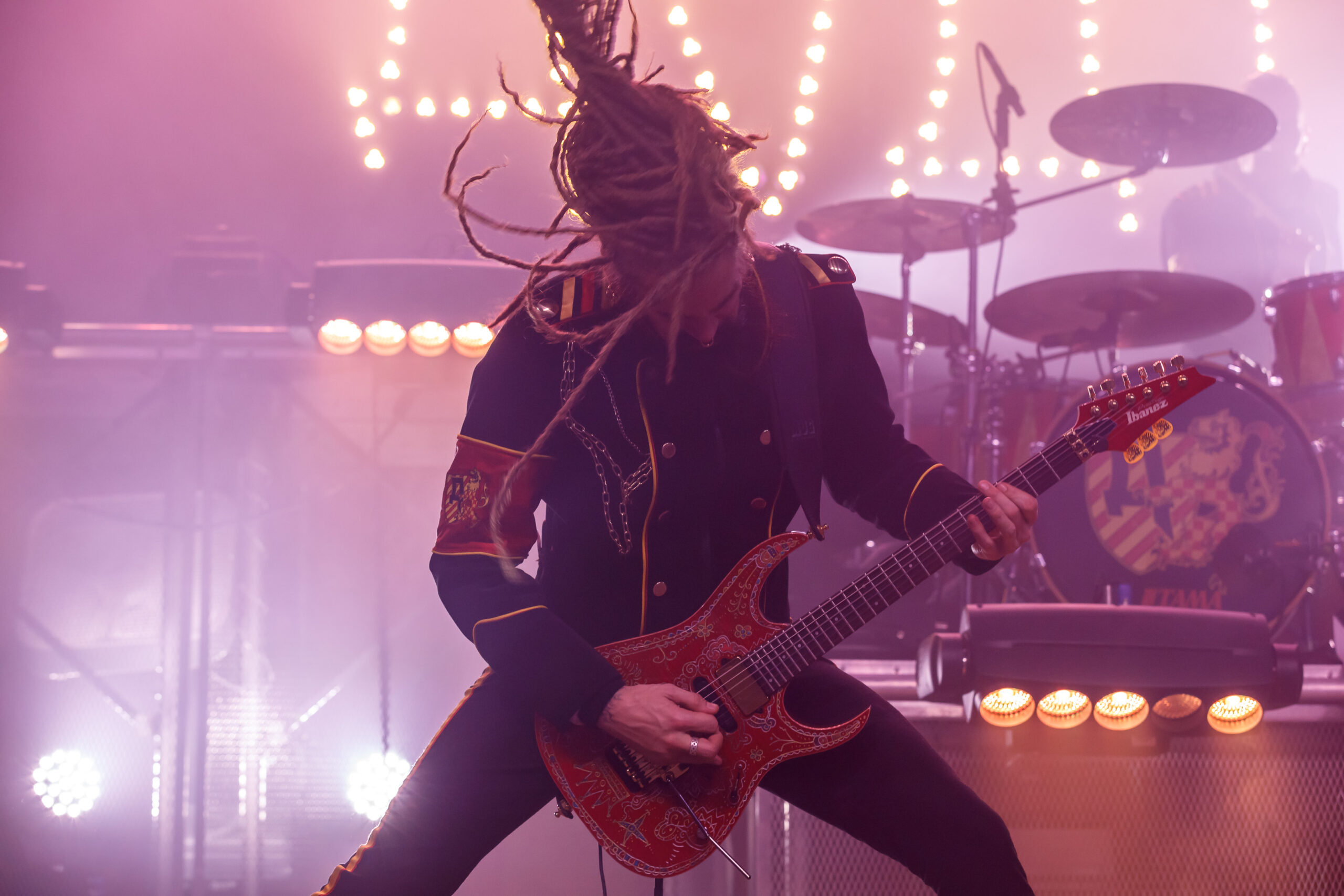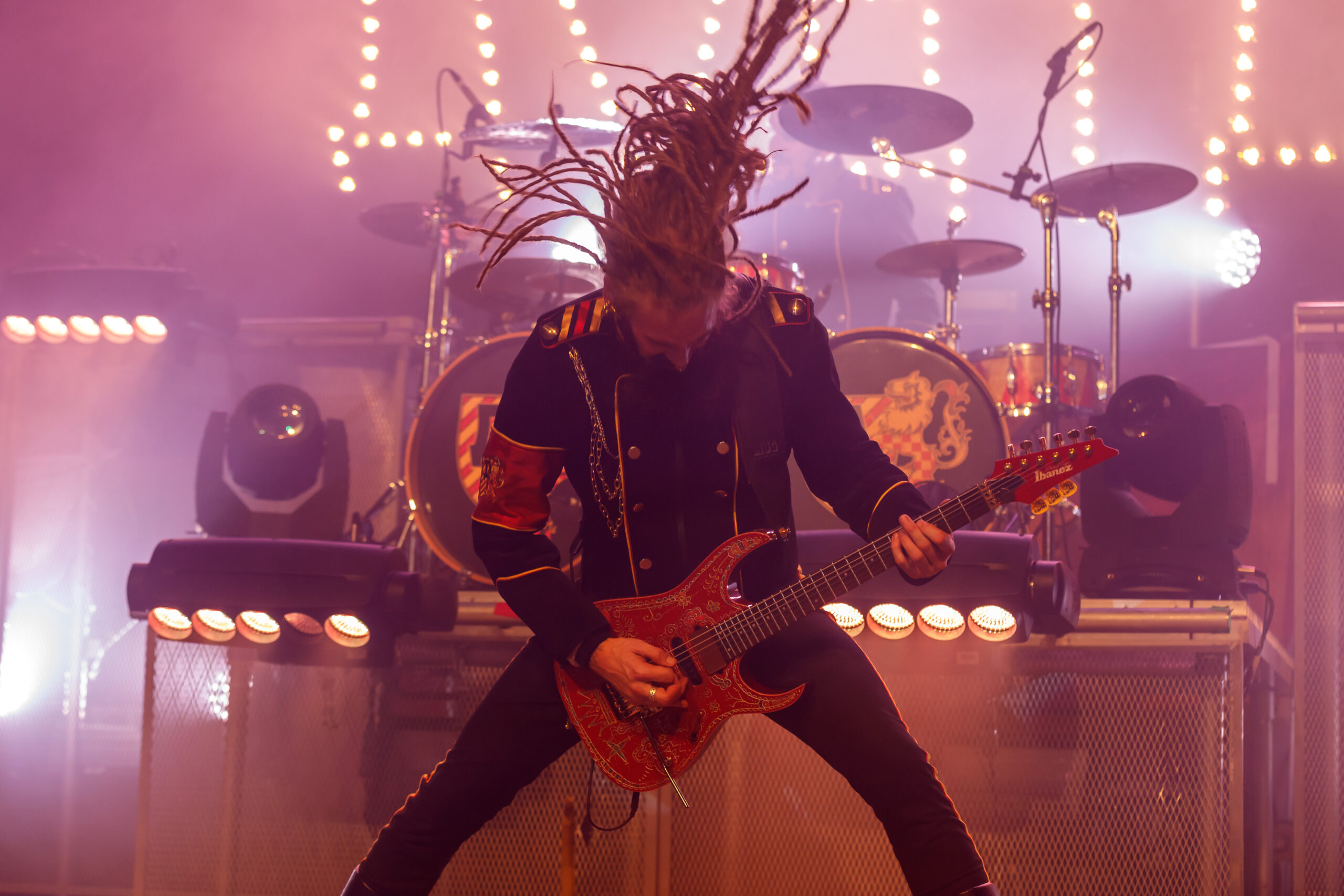 After the second song, Jonas removes his crown and robes (he has his manservant do it) and struts down from the raised platform and joins the rest of the band on the stage. He is handed is guitar and they start to play “Let It Burn”. Now the real head banging of the guitar players begin. Jonas has long hair that is in dreadlocks and as he head bangs, his hair goes everywhere.