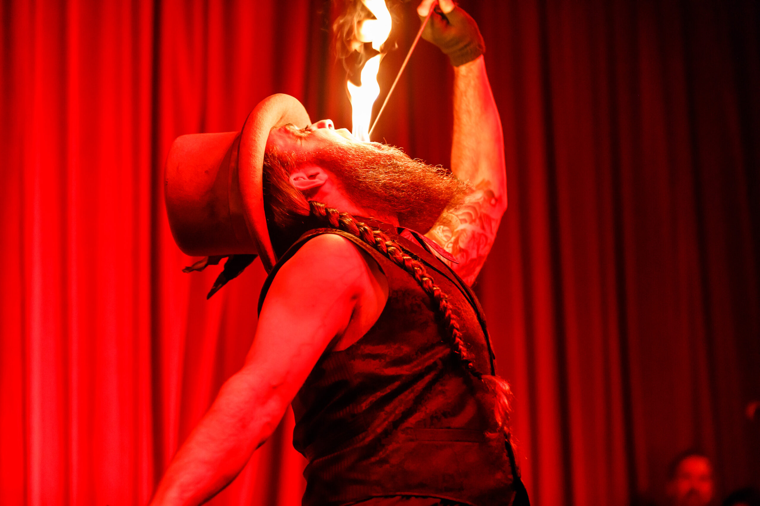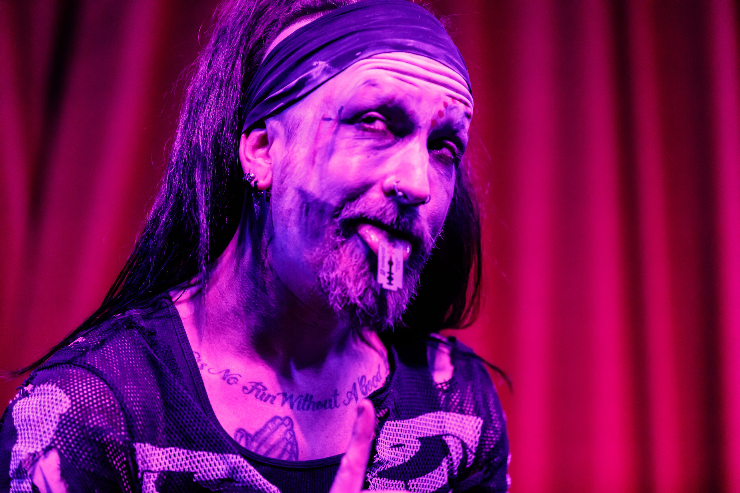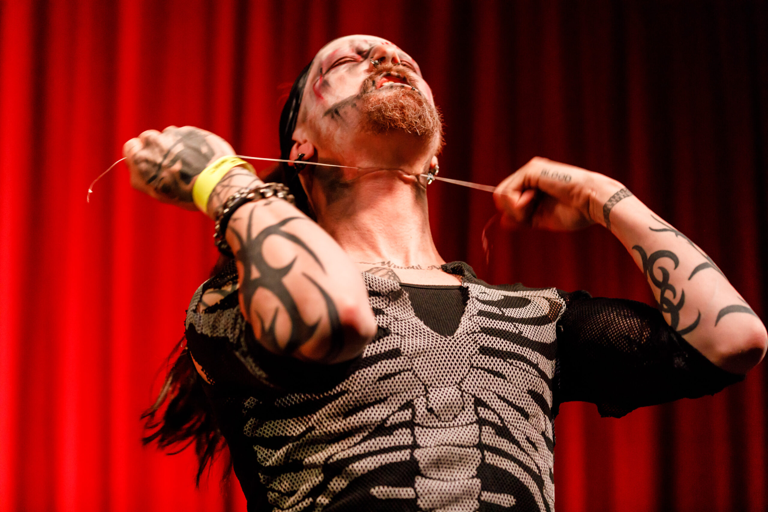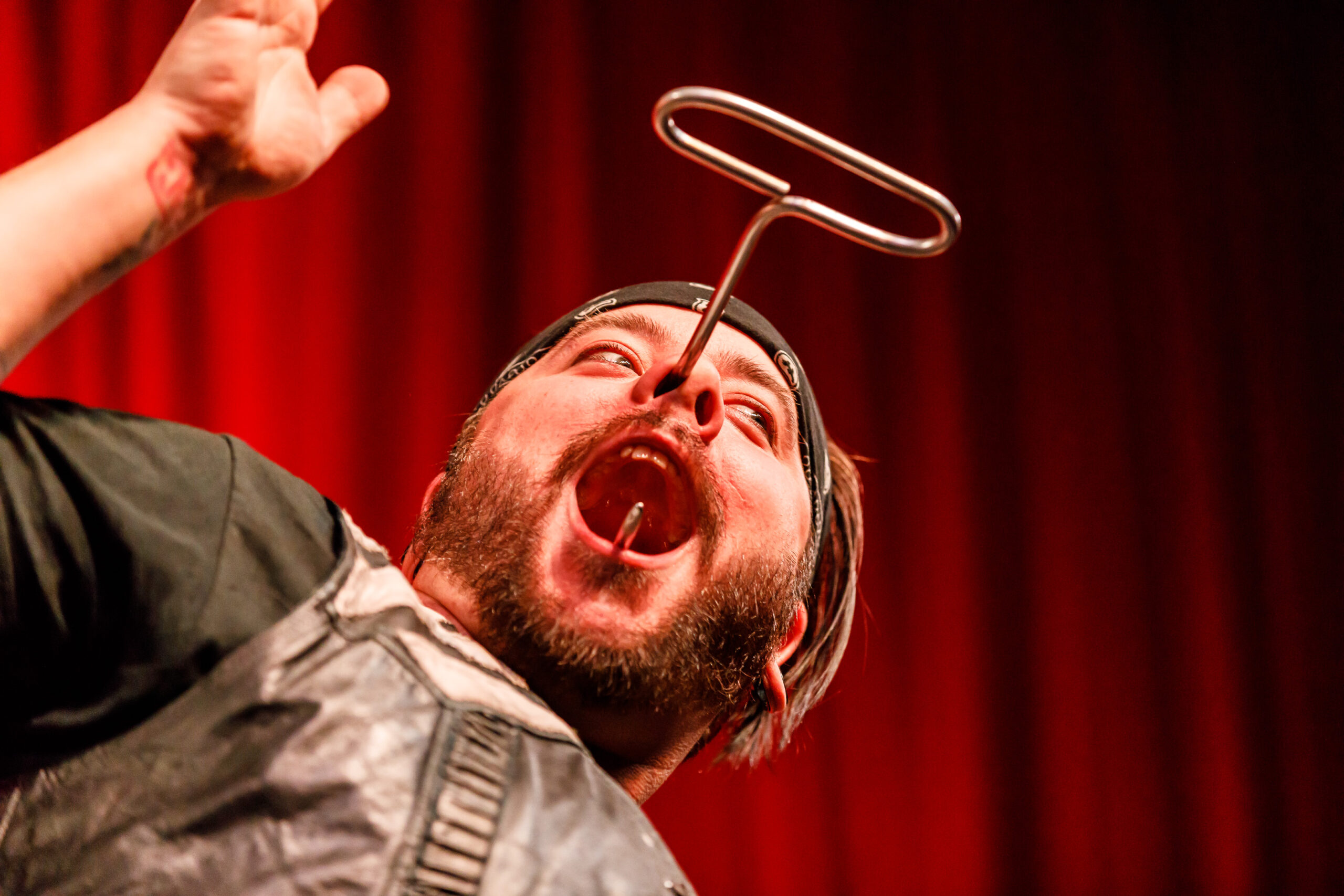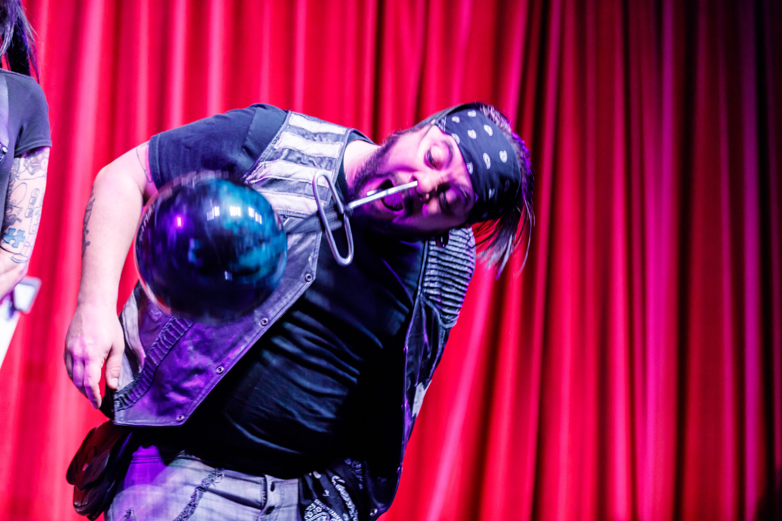 This was 1 really wild night. The evening started with what can best be described as a small circus sideshow called Hellzapoppin. Ring master and fire eater Bryce “the Govna” Graves came out and welcomed the crowd and told us to expect the unusual and the odd. He then started us off with him eating a number of turpentine coated sticks that were lit on fire. I can honestly tell you it was real, because I got turpentine on me when he did his fire breathing stunt. Next up was Short E. Dangerously, the half man. Short E. has no legs so he gets around on his hands. He got up on a platform and half barrel and did hand stands. He also did 1 handed pushups. Now comes the real bizarre part of the show, Ryan Stock puts a carabiner in his nose and eye lid clamps under each eye. His assistant, the lovely and scantily dressed Amber Lynn Walker starts to put cow bells on the chain under the nose ring and eye clamps. They start with 1, then 2, then 3 and finally 4. You think they are done, but no, Amber then adds a bowling ball. Ryan starts to swing the cowbells and bowling ball around under his head. To round out this group of performers is Dan Sperry. He is a magician that is dressed in a skeleton short and full face makeup. His first trick is to put a lifesaver in his mouth and then take some string and as he “cuts” into his throat, he pulls out the lifesaver into the string. Other stunts down are sword swallowing, drive bit swallowing, Ice pick into the nose, walking on glass and pigeon tricks. Overall it was a great show and well worth seeing. It reminded me of the days in the 60s when I was in Atlantic City and would see the sideshow performers as I walked along the boardwalk. They are very nice people and I met them after the show as they were getting their picture taken with some of the audience.
