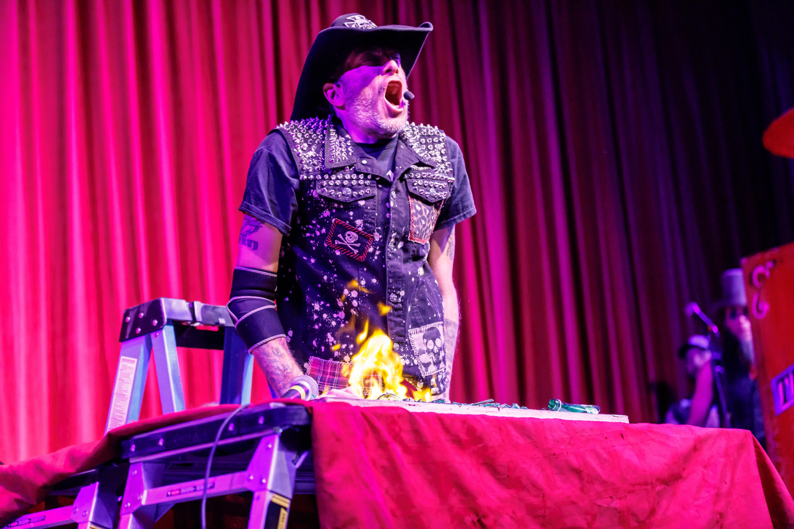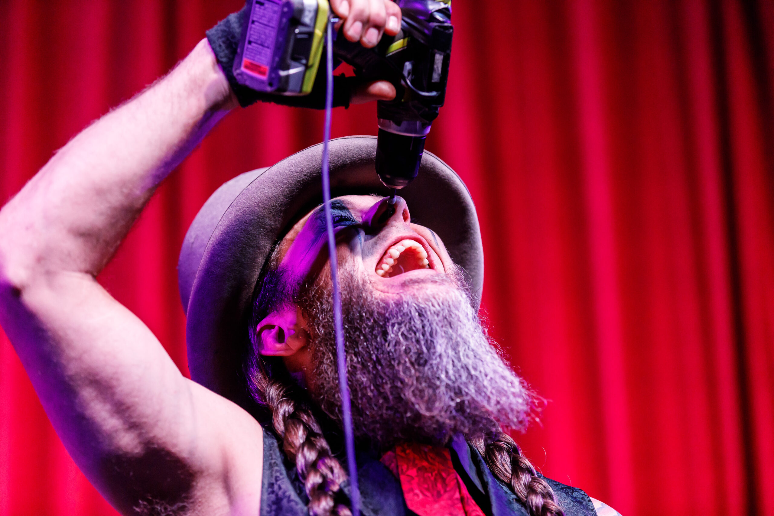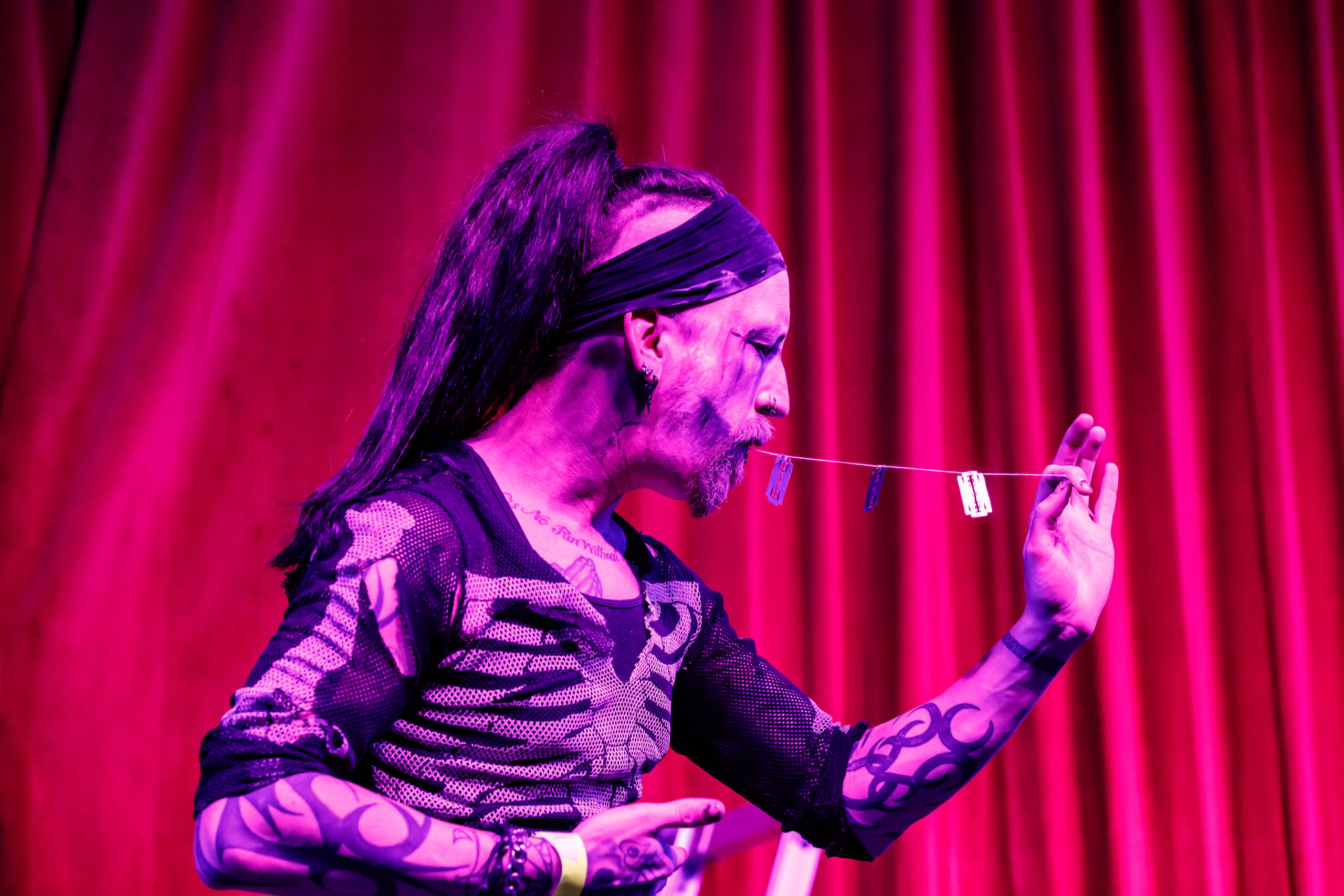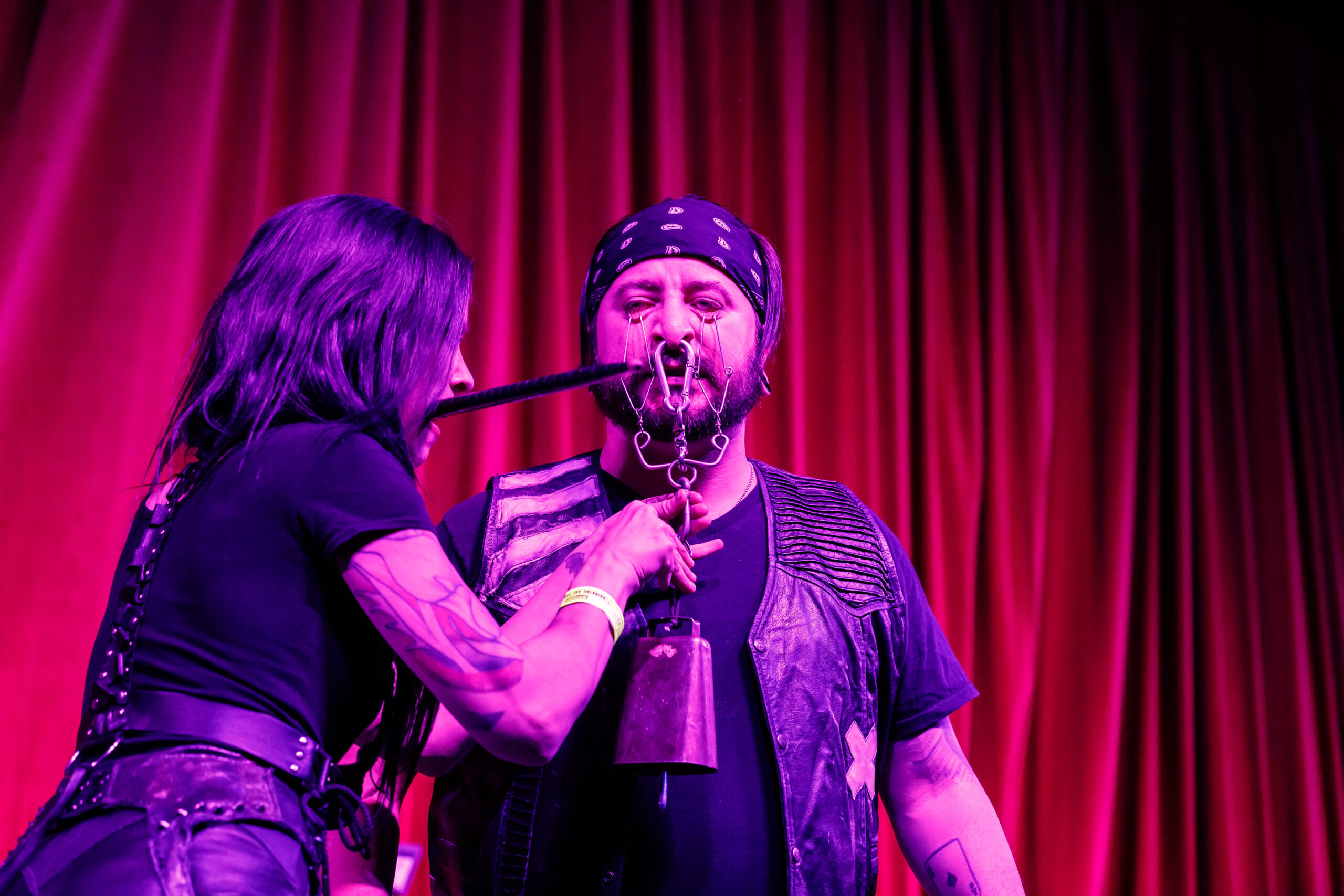 This was 1 really wild night. The evening started with what can best be described as a small circus sideshow called Hellzapoppin. Ring master and fire eater Bryce “the Govna” Graves came out and welcomed the crowd and told us to expect the unusual and the odd. He then started us off with him eating a number of turpentine coated sticks that were lit on fire. I can honestly tell you it was real, because I got turpentine on me when he did his fire breathing stunt. Next up was Short E. Dangerously, the half man. Short E. has no legs so he gets around on his hands. He got up on a platform and half barrel and did hand stands. He also did 1 handed pushups. Now comes the real bizarre part of the show, Ryan Stock puts a carabiner in his nose and eye lid clamps under each eye. His assistant, the lovely and scantily dressed Amber Lynn Walker starts to put cow bells on the chain under the nose ring and eye clamps. They start with 1, then 2, then 3 and finally 4. You think they are done, but no, Amber then adds a bowling ball. Ryan starts to swing the cowbells and bowling ball around under his head. To round out this group of performers is Dan Sperry. He is a magician that is dressed in a skeleton short and full face makeup. His first trick is to put a lifesaver in his mouth and then take some string and as he “cuts” into his throat, he pulls out the lifesaver into the string. Other stunts down are sword swallowing, drive bit swallowing, Ice pick into the nose, walking on glass and pigeon tricks. Overall it was a great show and well worth seeing. It reminded me of the days in the 60s when I was in Atlantic City and would see the sideshow performers as I walked along the boardwalk. They are very nice people and I met them after the show as they were getting their picture taken with some of the audience.