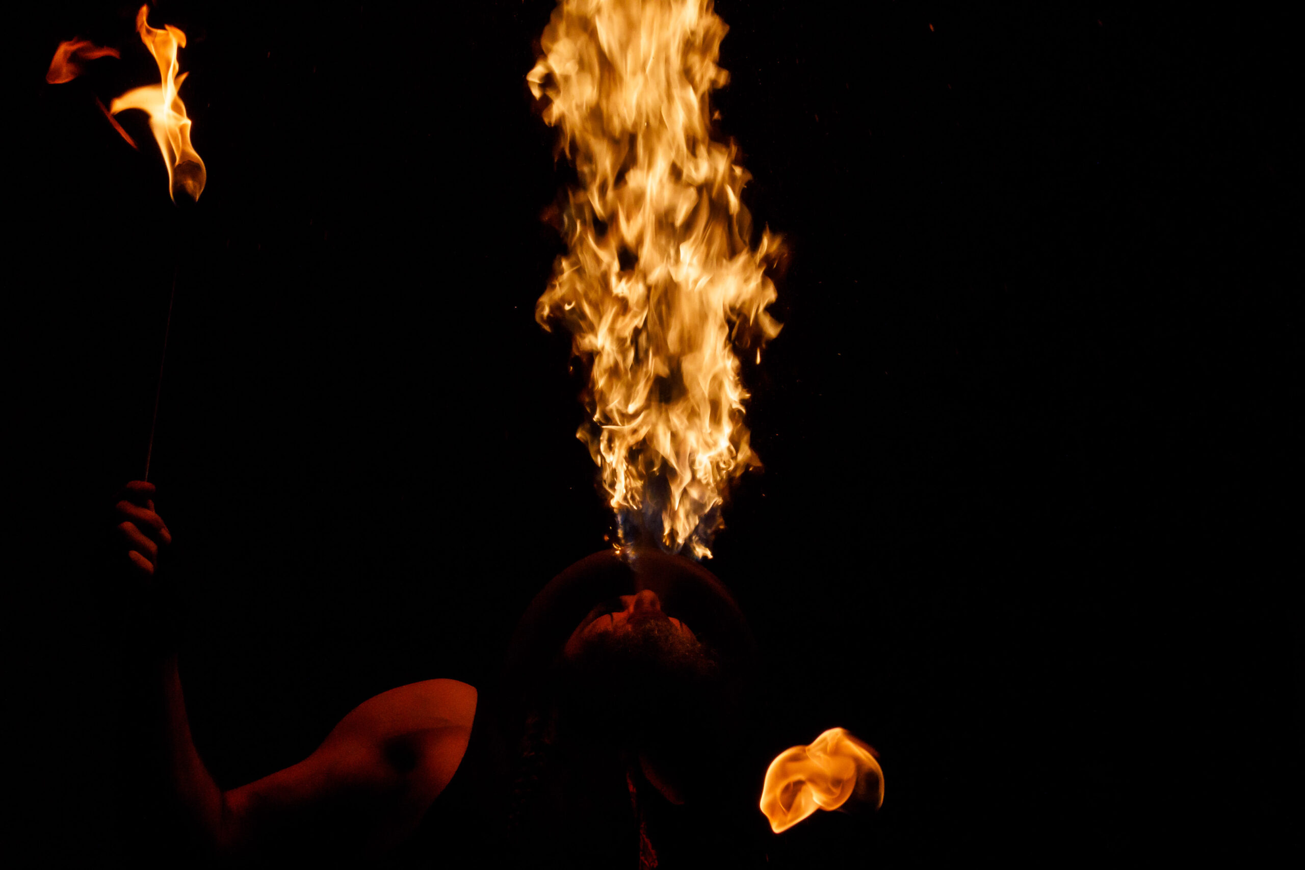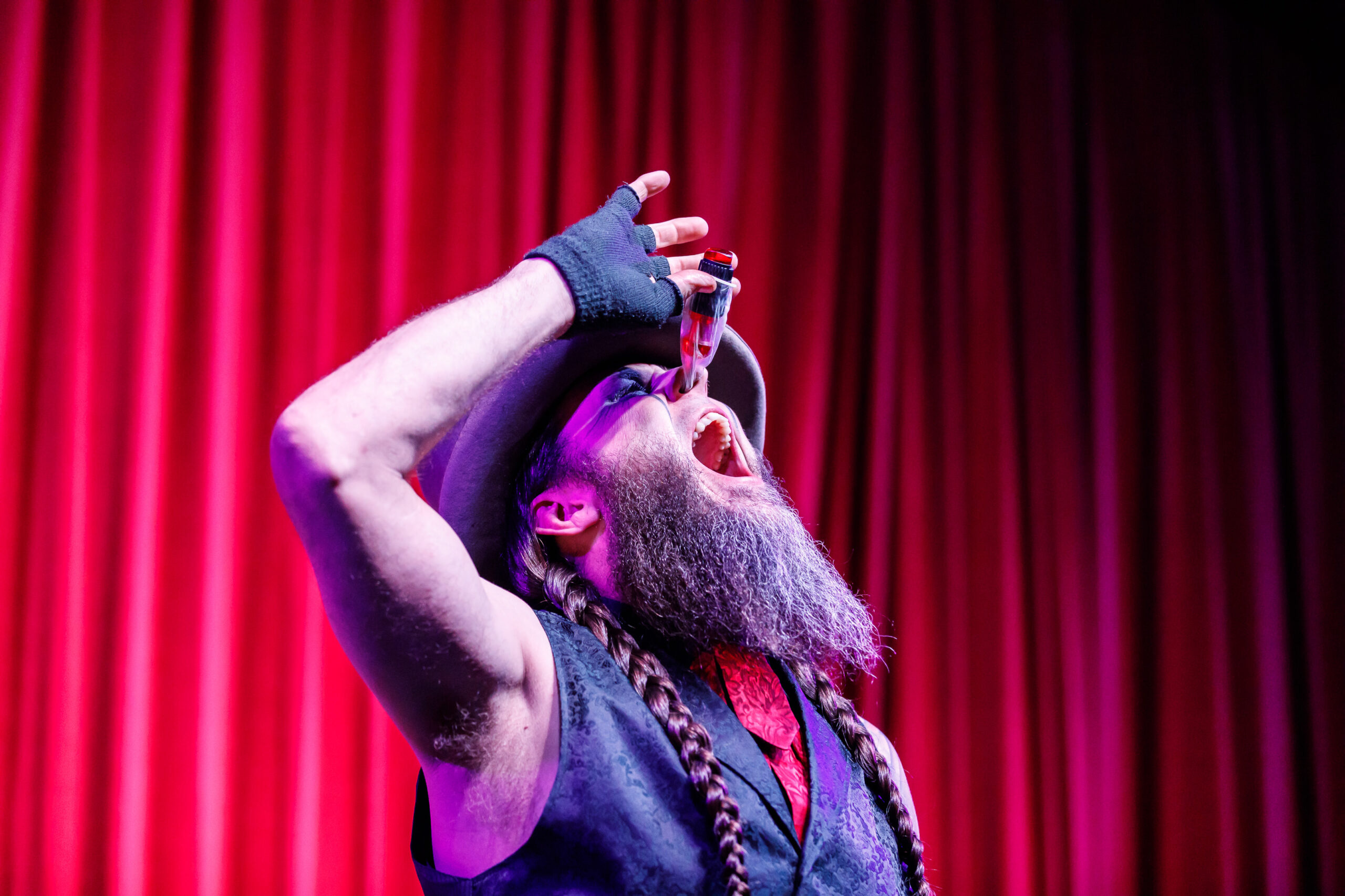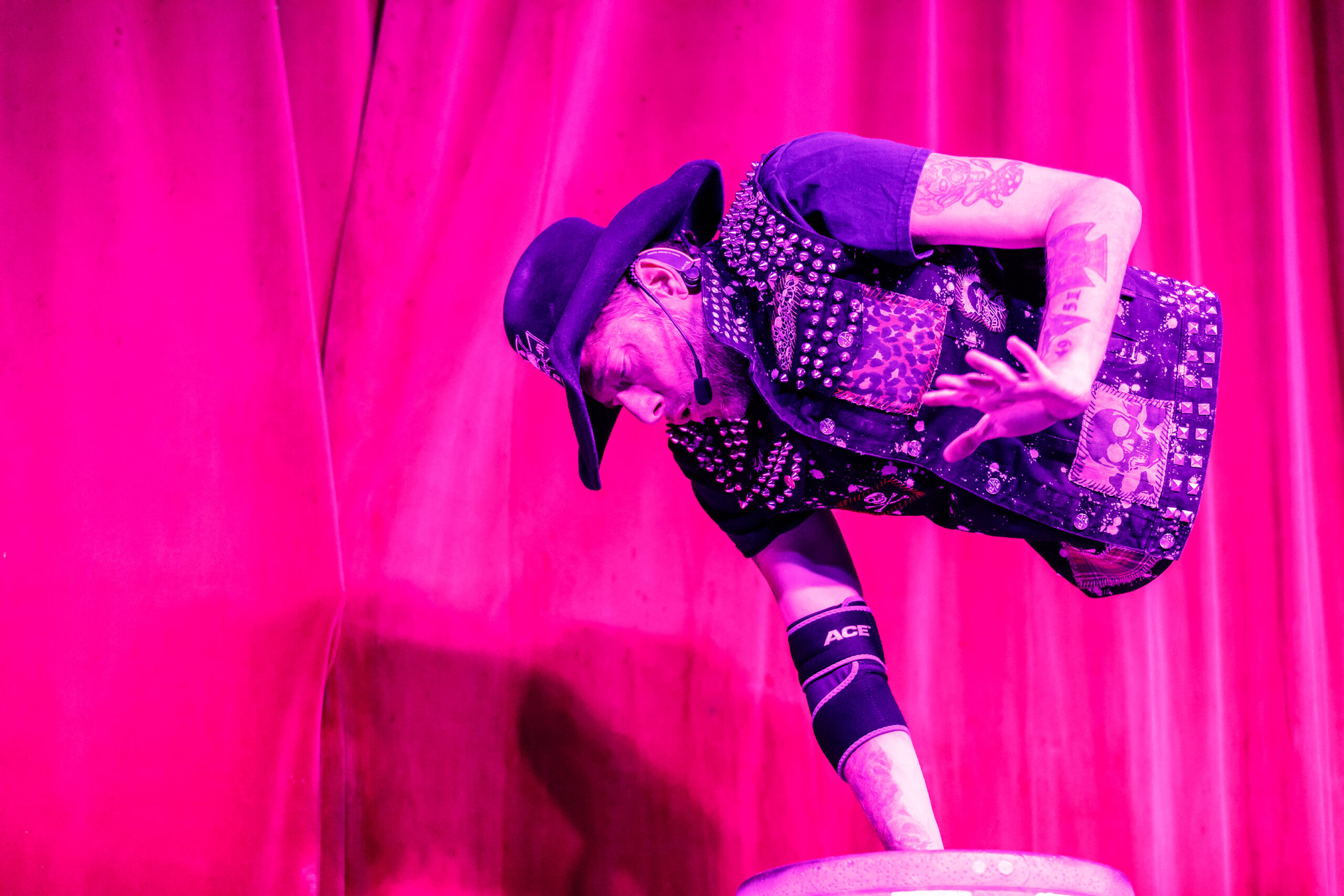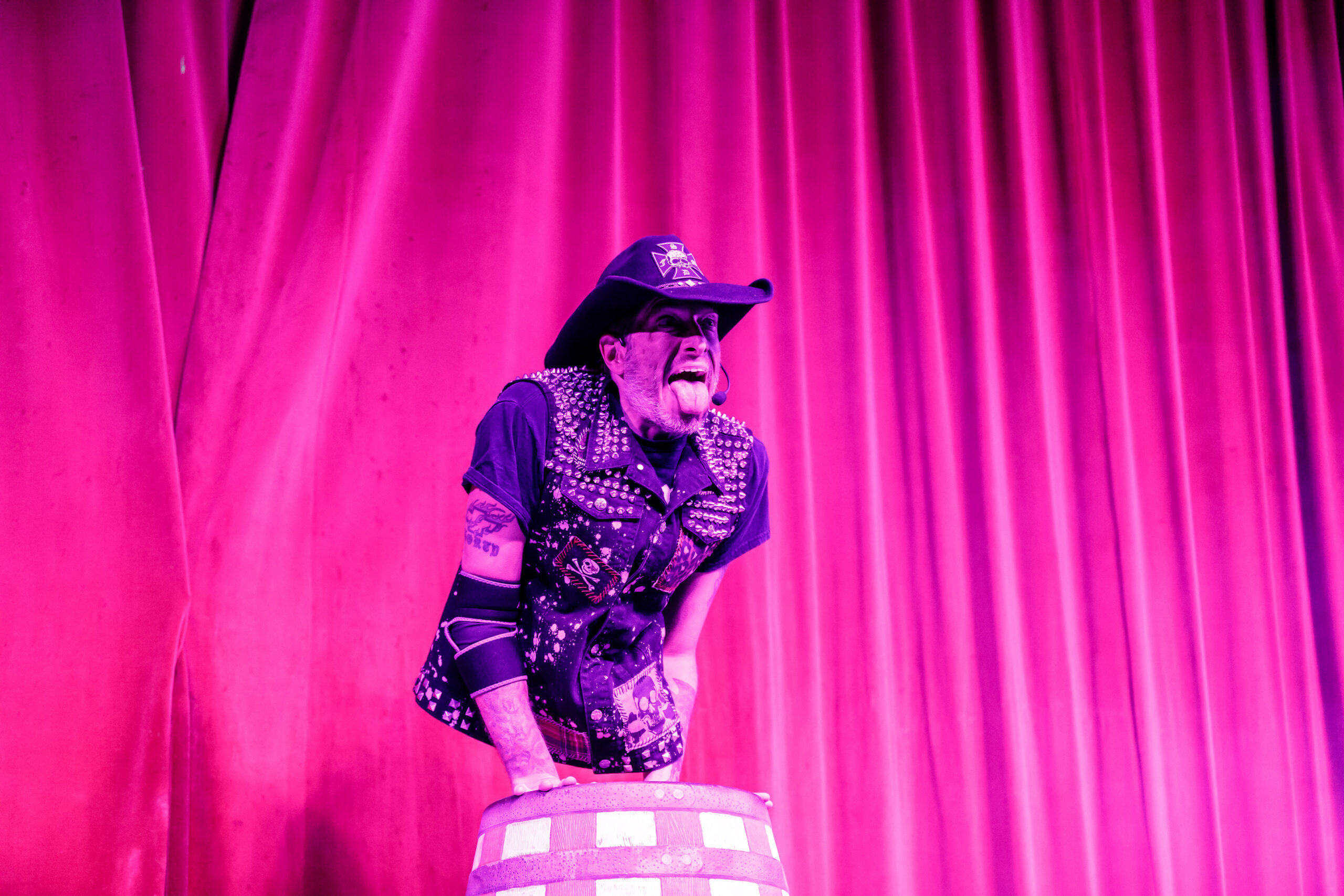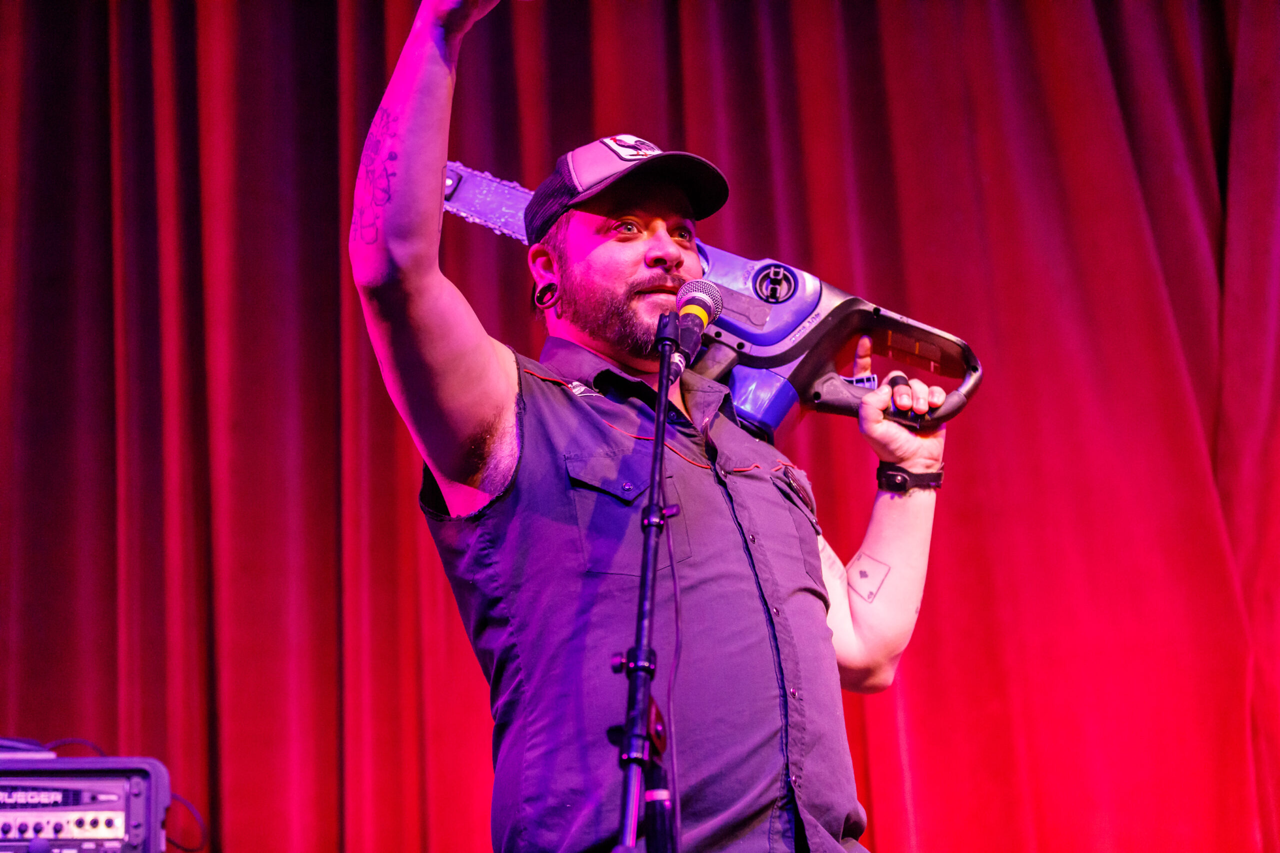 This was 1 really wild night. The evening started with what can best be described as a small circus sideshow called Hellzapoppin. Ring master and fire eater Bryce “the Govna” Graves came out and welcomed the crowd and told us to expect the unusual and the odd. He then started us off with him eating a number of turpentine coated sticks that were lit on fire. I can honestly tell you it was real, because I got turpentine on me when he did his fire breathing stunt. Next up was Short E. Dangerously, the half man. Short E. has no legs so he gets around on his hands. He got up on a platform and half barrel and did hand stands. He also did 1 handed pushups. Now comes the real bizarre part of the show, Ryan Stock puts a carabiner in his nose and eye lid clamps under each eye. His assistant, the lovely and scantily dressed Amber Lynn Walker starts to put cow bells on the chain under the nose ring and eye clamps. They start with 1, then 2, then 3 and finally 4. You think they are done, but no, Amber then adds a bowling ball. Ryan starts to swing the cowbells and bowling ball around under his head. To round out this group of performers is Dan Sperry. He is a magician that is dressed in a skeleton short and full face makeup. His first trick is to put a lifesaver in his mouth and then take some string and as he “cuts” into his throat, he pulls out the lifesaver into the string. Other stunts down are sword swallowing, drive bit swallowing, Ice pick into the nose, walking on glass and pigeon tricks. Overall it was a great show and well worth seeing. It reminded me of the days in the 60s when I was in Atlantic City and would see the sideshow performers as I walked along the boardwalk. They are very nice people and I met them after the show as they were getting their picture taken with some of the audience.