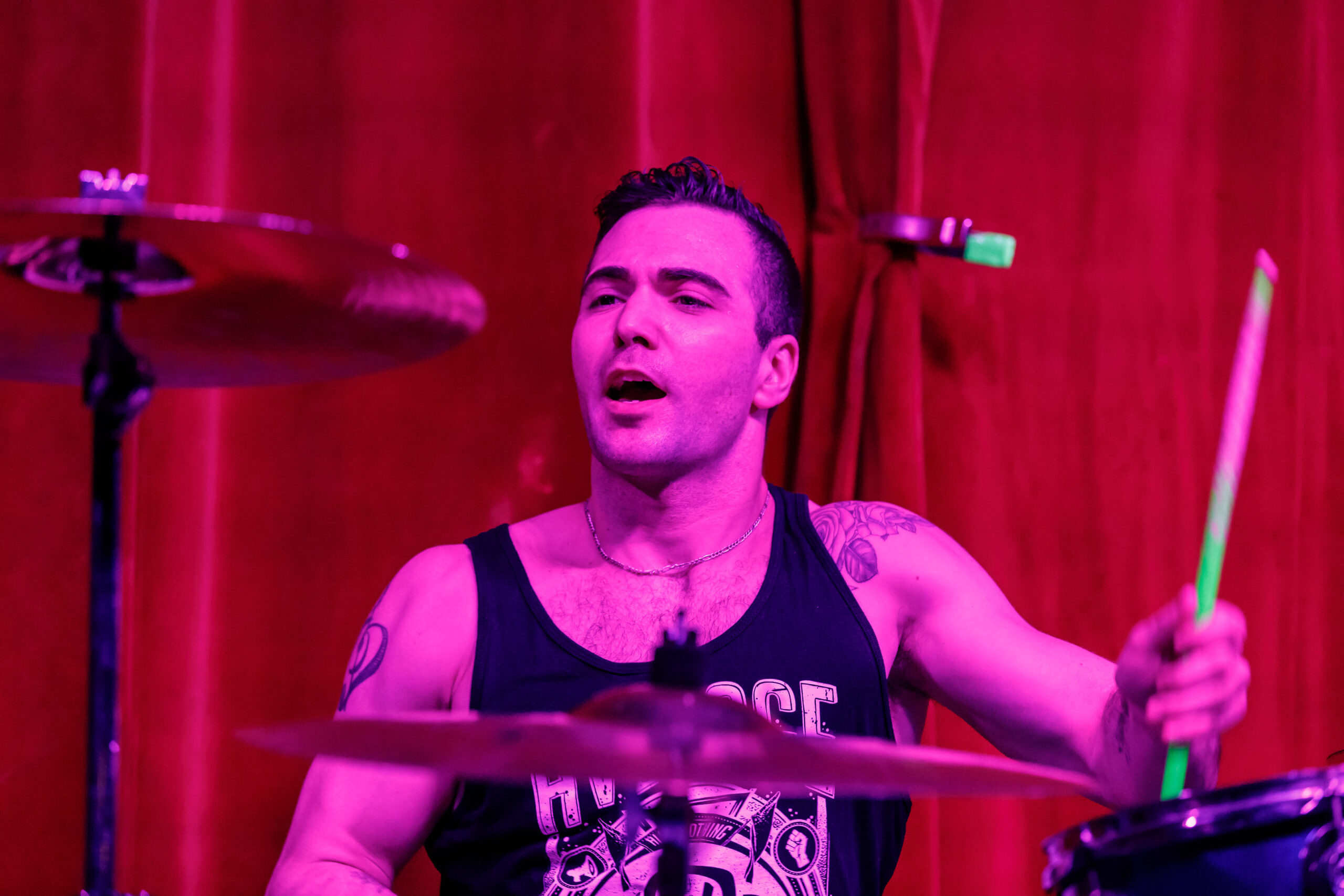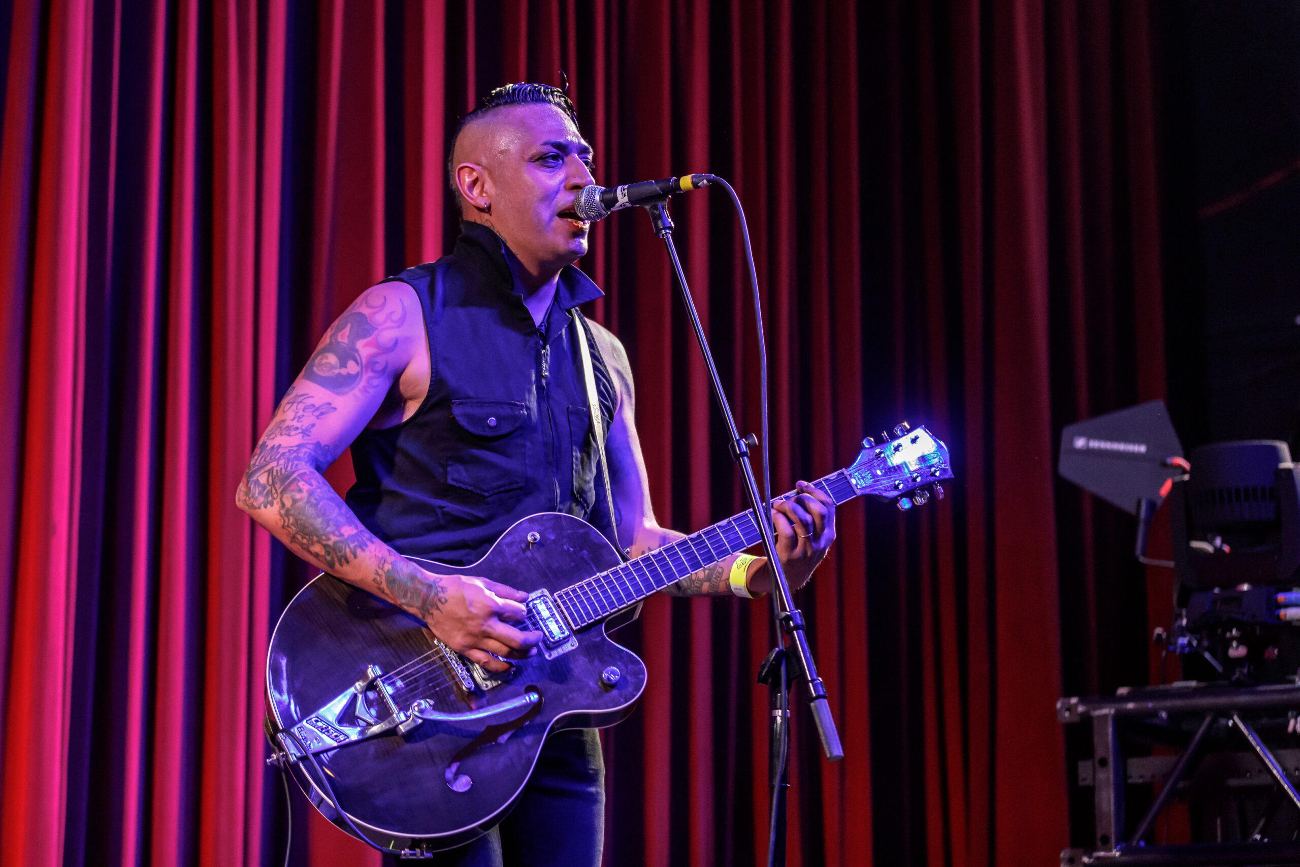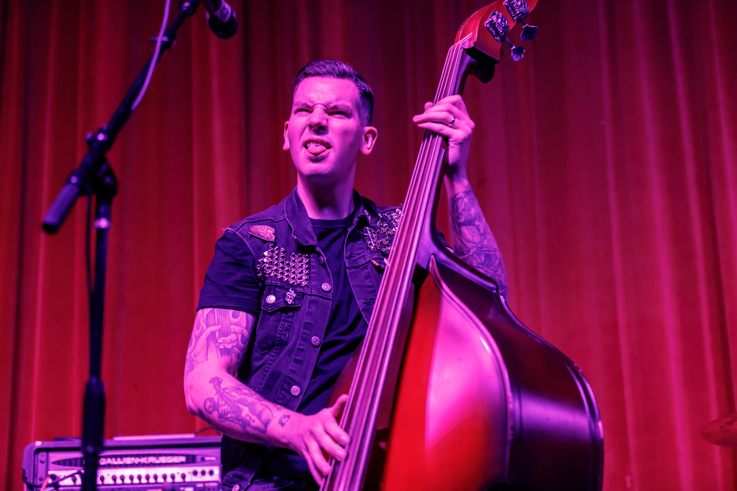Next up was a 3-piece band from Montreal Canada called The Brains. The band consists of members Rene D la Muerte (lead vocals, guitar), Colin The Dead (double bass, Backing vocals) and Phil The Beast (Drums). Their style is a what they call Canadian Psychobilly. They remind me of the Stray Cats back in the 80s.