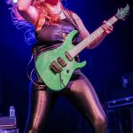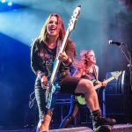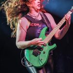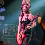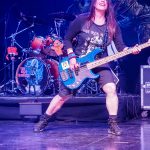 Linda McDonald does not have the extreme drumkit that Nicko has, but she definitely played the hell out of her kit.  She even jokingly looked at me as I photographed her.  Courtney, “ccshred” lived up to her handle as she tore into her guitar grinding out power riff after power riff.  She traded lead roles with Nikki who provided many of the band’s guitar leads.  Between Nikki and Courtney, they complemented each other trading lead and rhythm roles.  Wanda was similar to Steve Harris in providing the song’s bass lines.  She also was animated running up to the front of the stage playing to the audience and then moving back and getting air as she jumped to the music.  Kirsten as just amazing in her performance.  She moved around on the stage just like Bruce, poring her heart into each song.  She even put on the Trooper jacket and came out waving the flag during their performance of “The Trooper”.