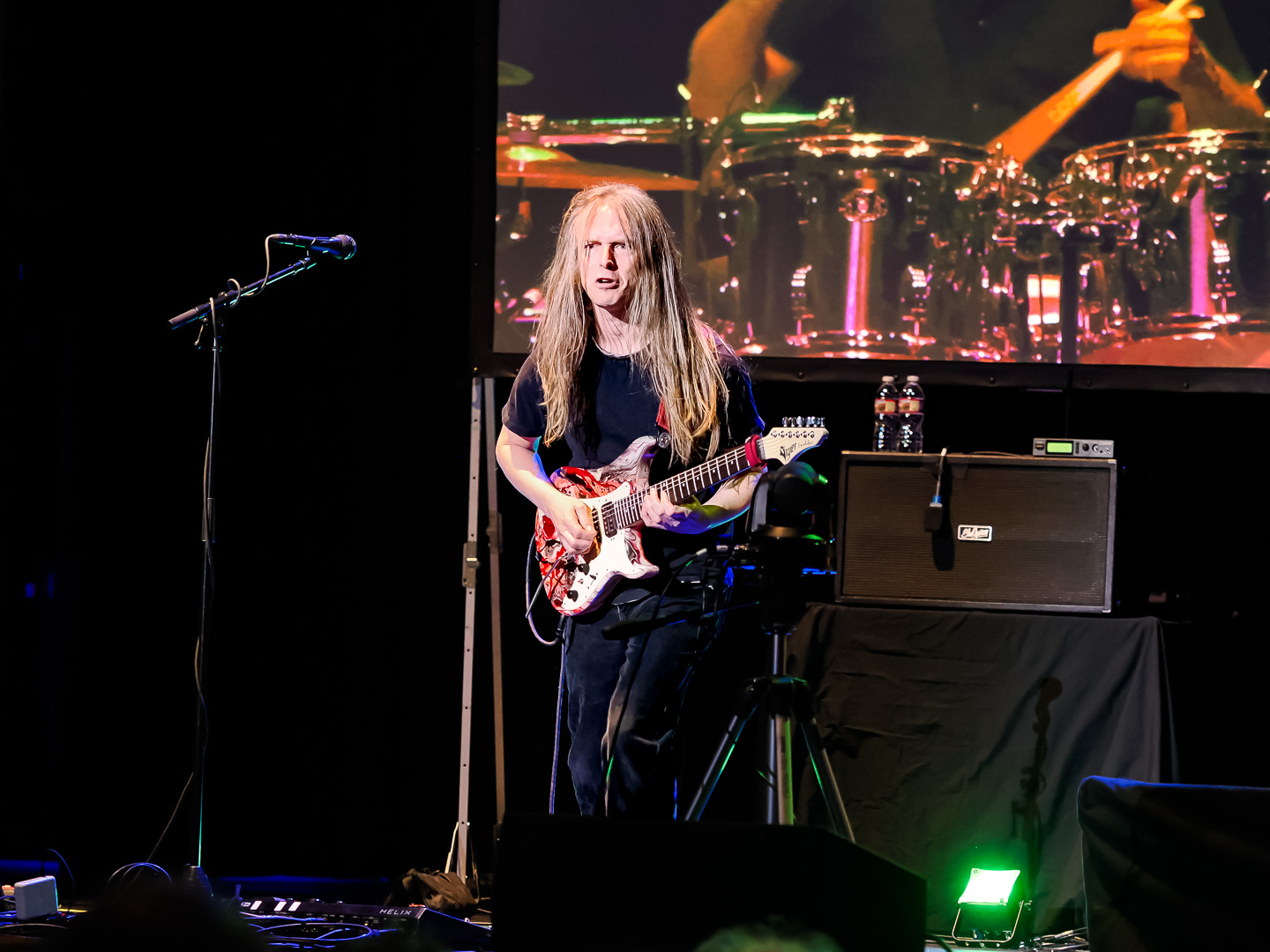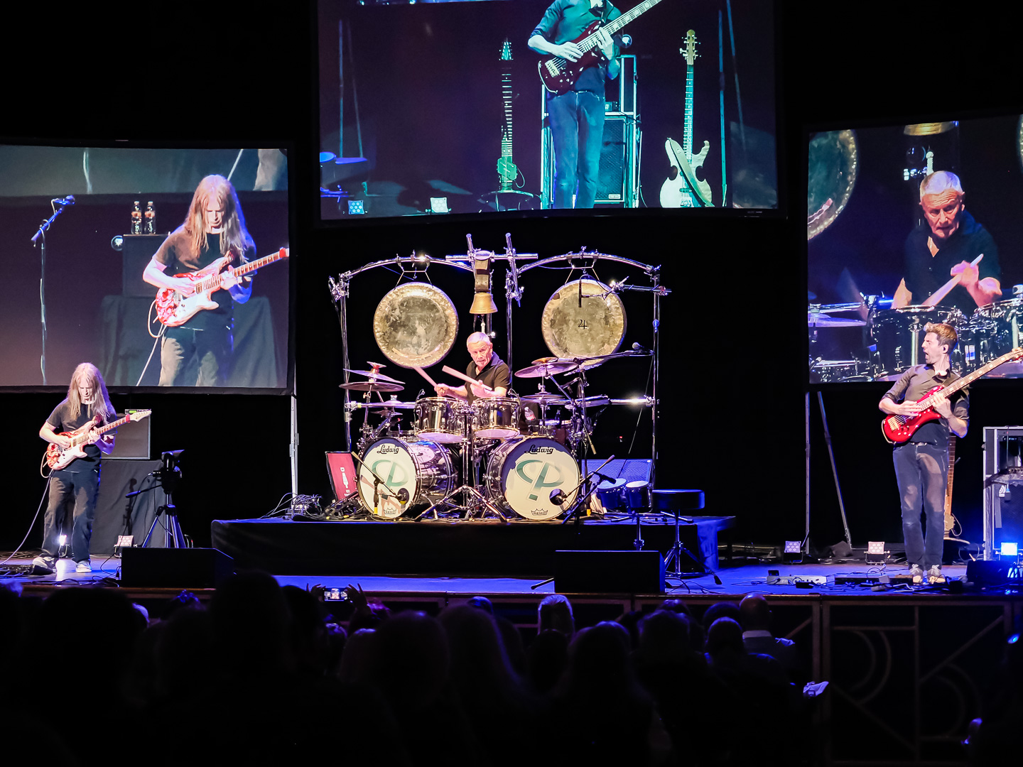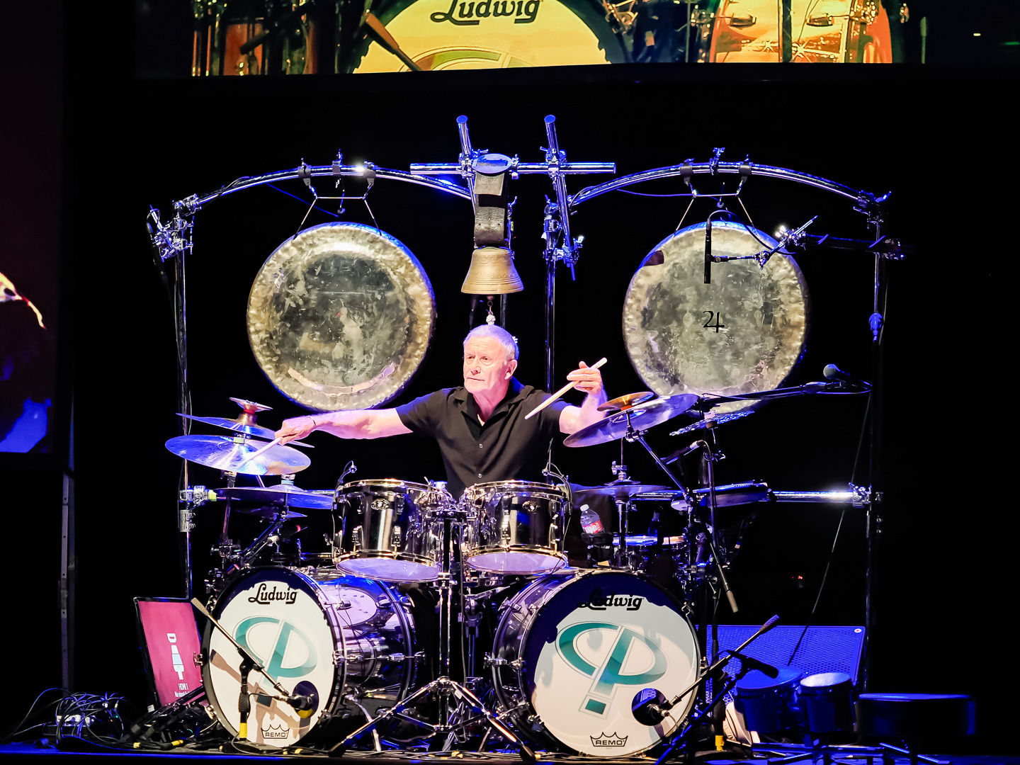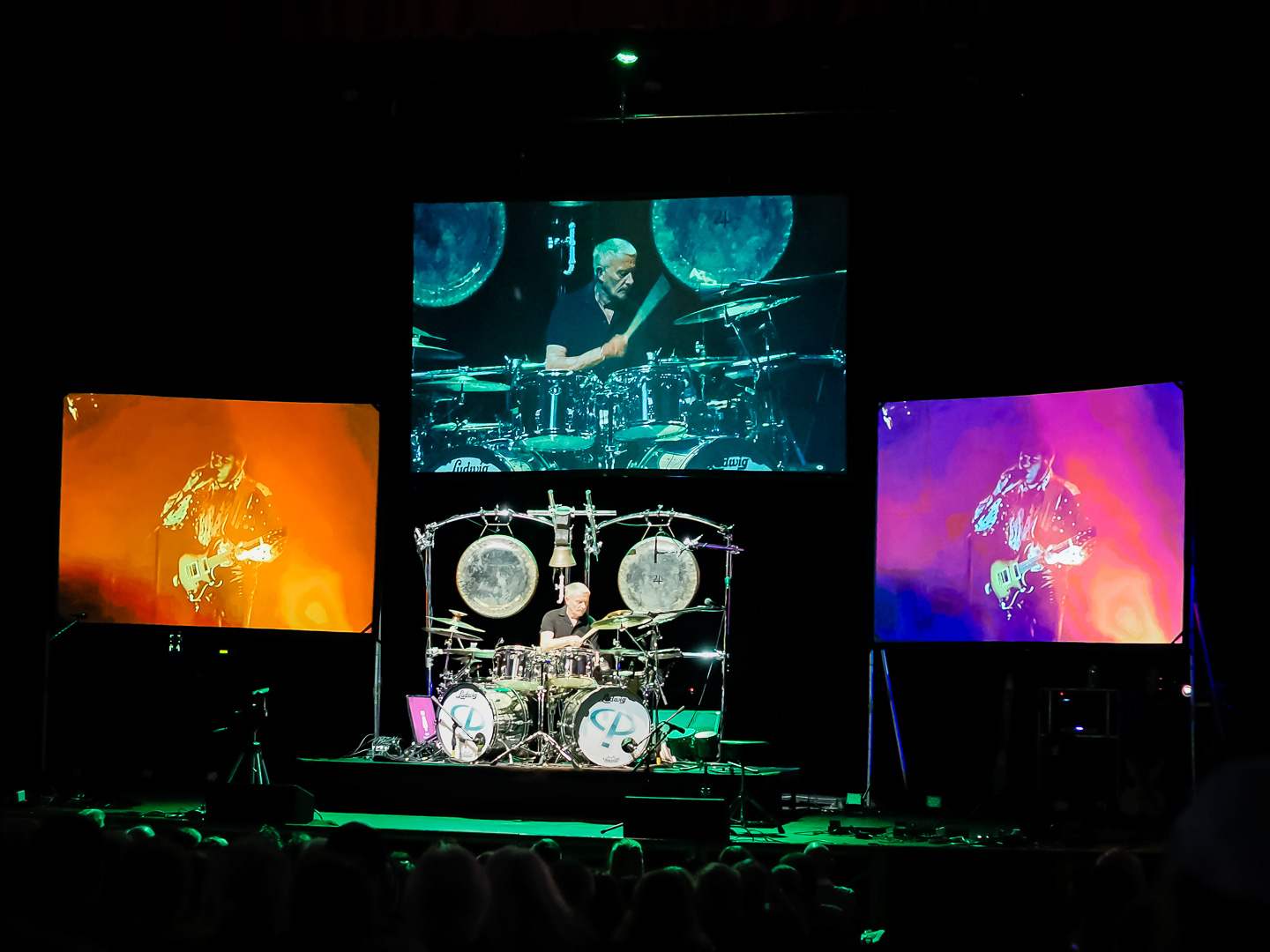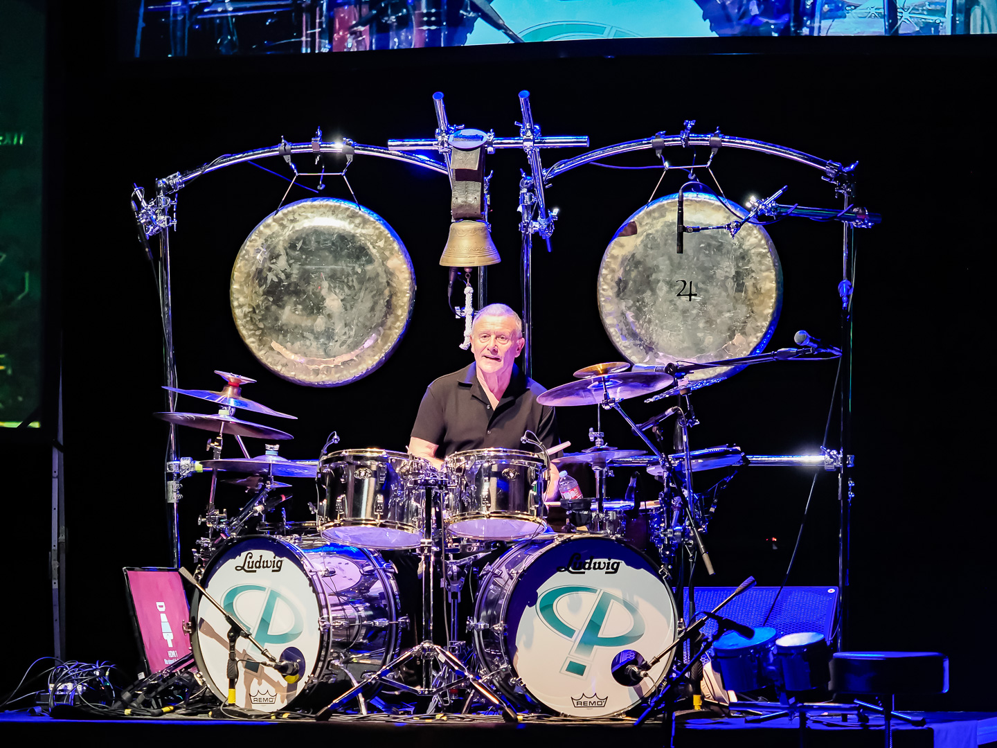 Carl and his drum kit are positioned in the center of the stage.  He is flanked by 2 large video screens on either side and one behind and above him.  During the show different concert footage of Greg and Keith are played on the screens.  They also play some of the animated videos that were created for different ELP songs.  Carl was joined on stage by his current band mates, guitarist Paul Bielatowicz and bassist Simon Fitzpatrick.